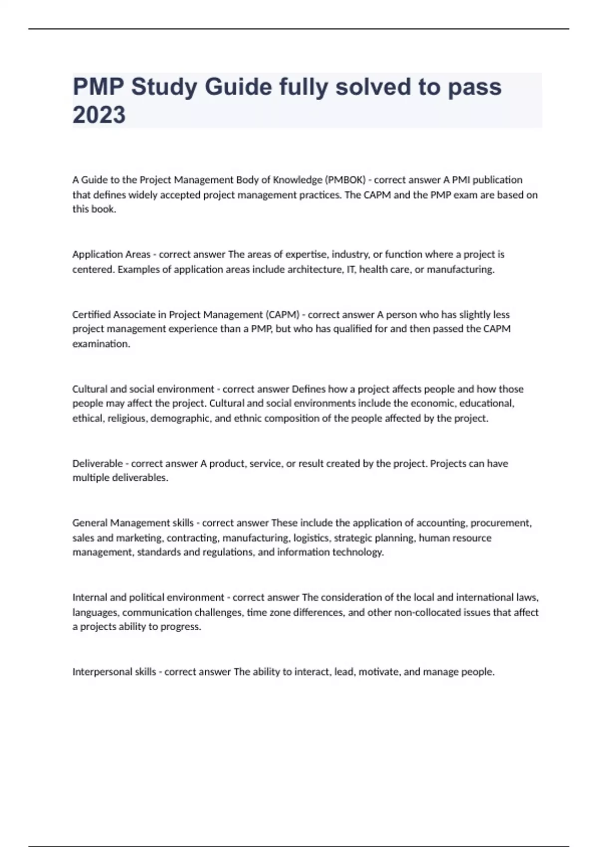 PMP Study Guide fully solved to pass 2023A Guide to the Project Management Body of Knowledge (PMBOK) - correct answer A PMI publication that defines widely accepted project management practices. The CAPM and the PMP exam are based on this book. Application Areas - correct answer The areas of expertise, industry, or function where a project is centered. Examples of application areas include architecture, IT, health care, or manufacturing. Certified Associate in Project Management (CAPM) - correct answer A person who has slightly less project management experience than a PMP, but who has qualified for and then passed the CAPM examination. Cultural and social environment - correct answer Defines how a project affects people and how those people may affect the project. Cultural and social environments include the economic, educational, ethical, religious, demographic, and ethnic composition of the people affected by the project. Deliverable - correct answer A product, service, or result created by the project. Projects can have multiple deliverables. General Management skills - correct answer These include the application of accounting, procurement, sales and marketing, contracting, manufacturing, logistics, strategic planning, human resource management, standards and regulations, and information technology. Internal and political environment - correct answer The consideration of the local and international laws, languages, communication challenges, time zone differences, and other non-collocated issues that affect a projects ability to progress. Interpersonal skills - correct answer The ability to interact, lead, motivate, and manage people. Iron Triangle of Project Management - correct answer A triangle with the characteristics of time, cost, and scope. Time, cost, and scope each constitute one side of the triangle; if any side of the Iron Triangle is not in balance with the other sides, the project will suffer. The Iron Triangle of Project Management is also known as the Triple Constraints of Project Management, as all projects are constrained by time, cost and scope. Physical environment - correct answer The physical structure and surroundings that affect a project's work. Program - correct answer A collection of related projects working in unison toward a common deliverable. Progressive Elaboration - correct answer The process of gathering project details in steady, uniform steps. This process uses deductive reasoning, logic, and a series of information-gathering techniques to identify details about a project product, or solution. Project - correct answer A short-term endeavor to create a unique product, service, or result. The end result of a project is also called a deliverable. Project Environment - correct answer The location and culture of the environment where the project work will reside. The project environment includes the social, economic, and environmental variables the project must work with or around. Project Management Institute (PMI) - correct answer An organization of project management professionals from around the world, supporting and promoting the careers, values, and concerns of project managers. Project management office (PMO) - correct answer A central office that oversees all projects within an organization of within a functional department. A PMO supports the project manager through software, training, templates, policies, communication, dispute resolution, and other services. Project Management Professional (PMP) - correct answer A person who has proven project management experience and has qualified for and then passed the PMP examination.