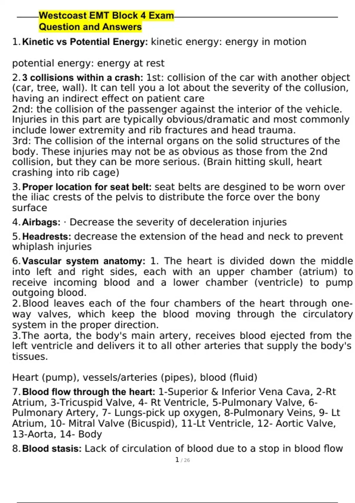 1. Kinetic vs Potential Energy: kinetic energy: energy in motion potential energy: energy at rest 2. 3 collisions within a crash: 1st: collision of the car with another object (car, tree, wall). It can tell you a lot about the severity of the collusion, having an indirect effect on patient care 2nd: the collision of the passenger against the interior of the vehicle. Injuries in this part are typically obvious/dramatic and most commonly include lower extremity and rib fractures and head trauma. 3rd: The collision of the internal organs on the solid structures of the body. These injuries may not be as obvious as those from the 2nd collision, but they can be more serious. (Brain hitting skull, heart crashing into rib cage) 3. Proper location for seat belt: seat belts are desgined to be worn over the iliac crests of the pelvis to distribute the force over the bony surface