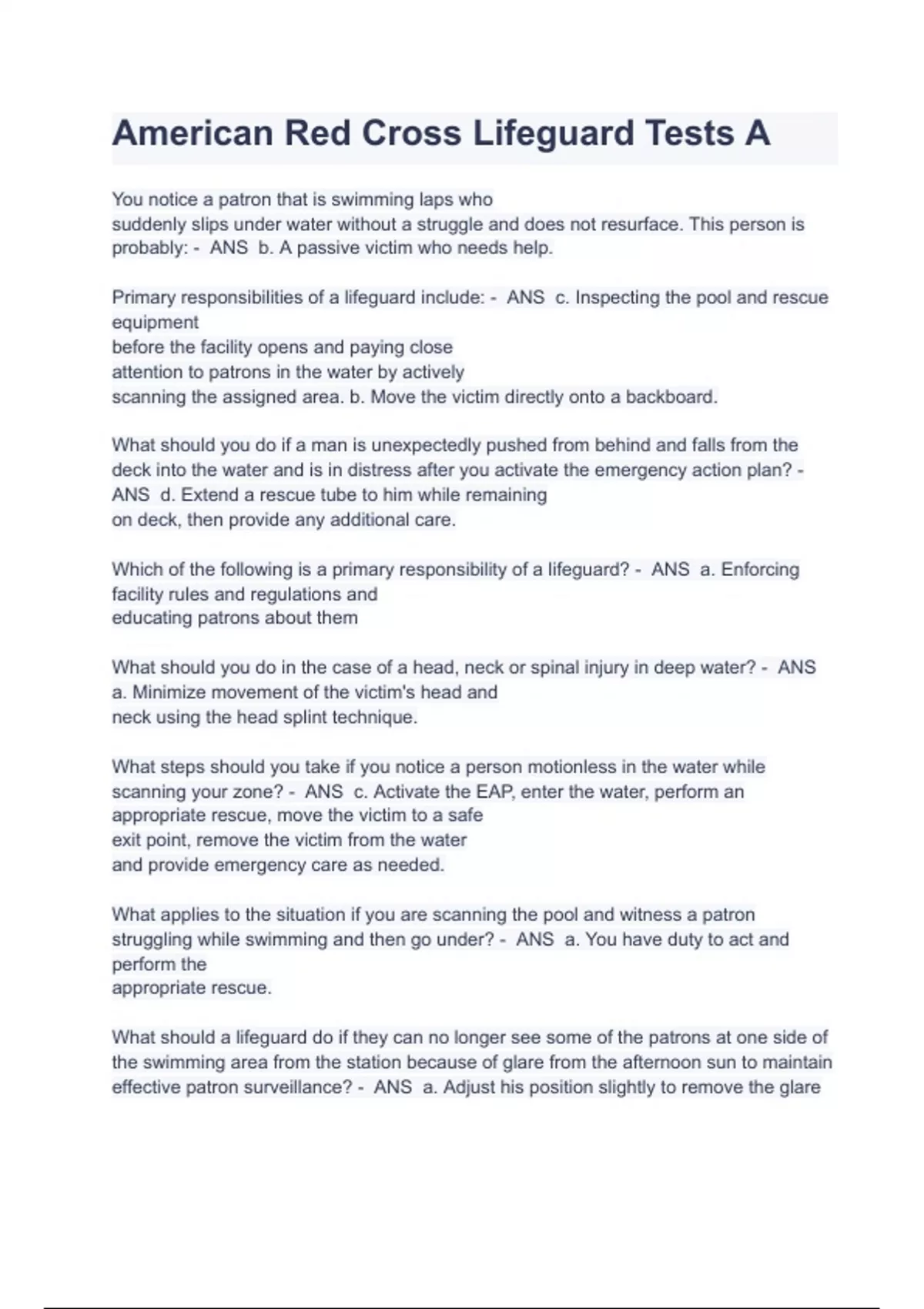 American Red Cross Lifeguard Tests A Questions 2022/2023 With Verified Answers A + Graded