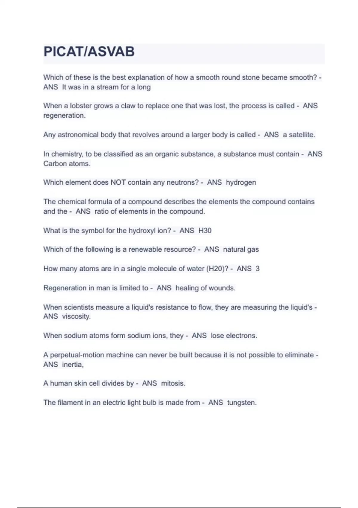 PICAT/ASVAB TEST QUESTIONS (193 Questions with 100% Correct Answers 100 % Verified A+ Graded