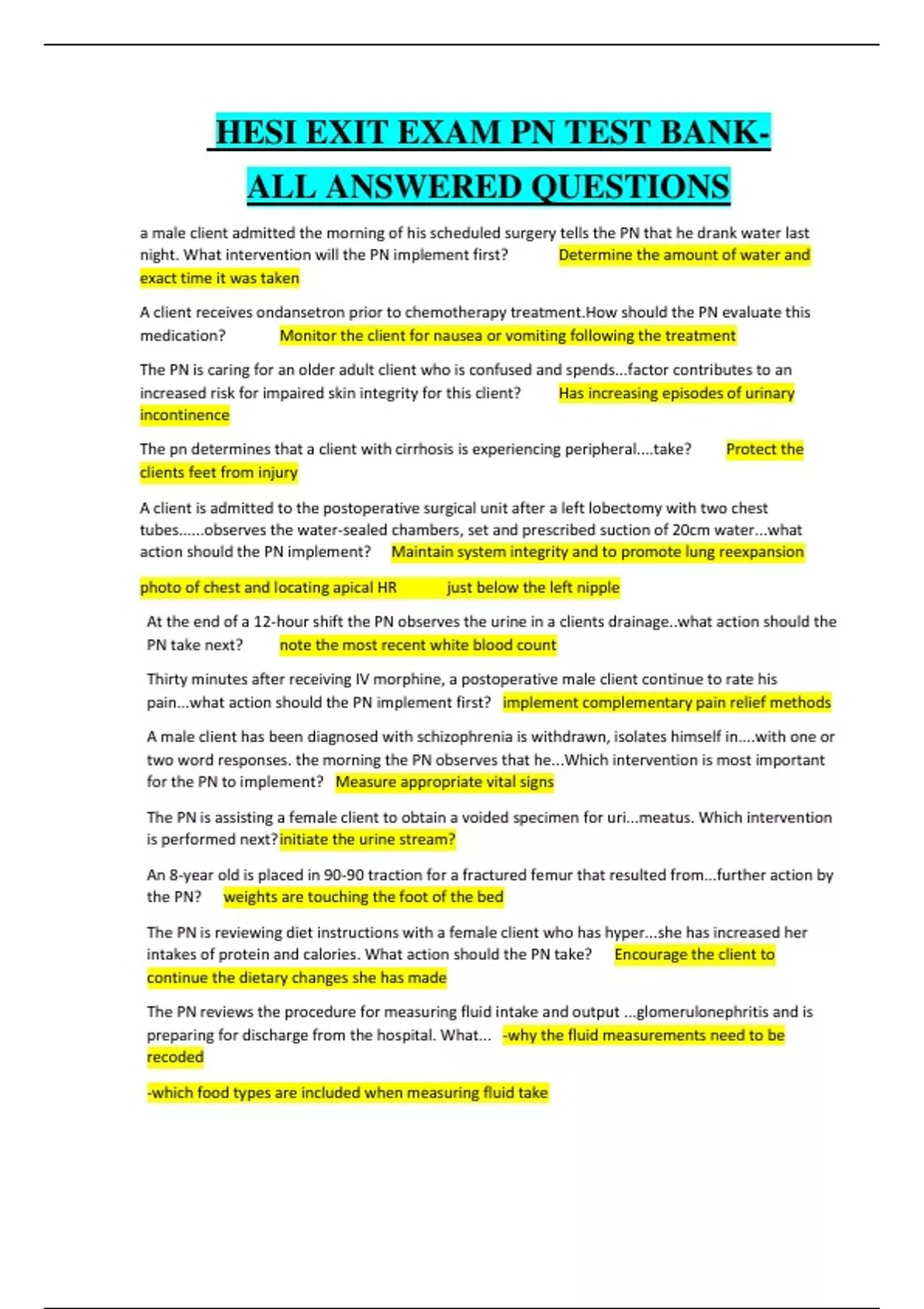 HESI EXIT EXAM PN TEST BANK- ALL ANSWERED QUESTIONS