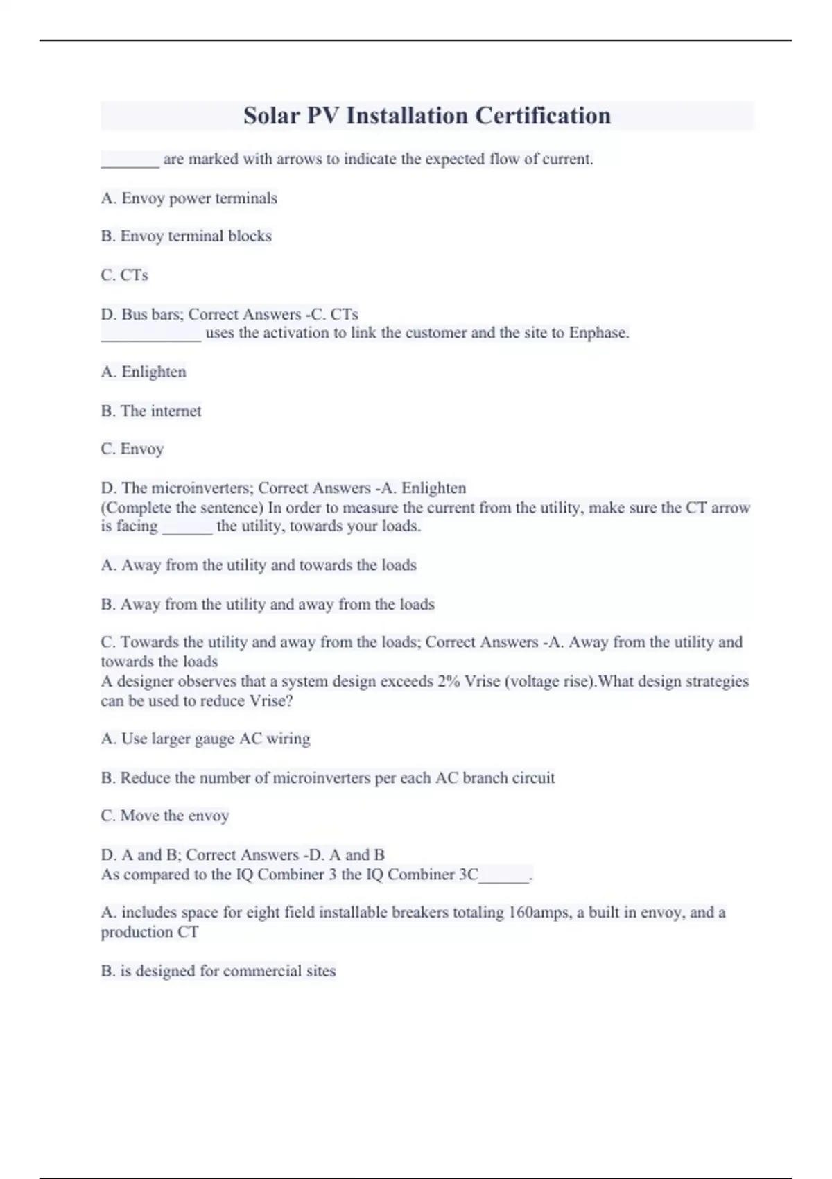 _______ are marked with arrows to indicate the expected flow of current. A. Envoy power terminals B. Envoy terminal blocks C. CTs D. Bus bars; Correct Answers -C. CTs ____________ uses the activation to link the customer and the site to Enphase. A. Enlighten B. The internet C. Envoy D. The microinverters; Correct Answers -A. Enlighten (Complete the sentence) In order to measure the current from the utility, make sure the CT arrow is facing ______ the utility, towards your loads. A. Away from the utility and towards the loads B. Away from the utility and away from the loads C. Towards the utility and away from the loads; Correct Answers -A. Away from the utility and towards the loads A designer observes that a system design exceeds 2% Vrise (voltage rise).What design strategies can be used to reduce Vrise? A. Use larger gauge AC wiring B. Reduce the number of microinverters per each AC branch circuit C. Move the envoy D. A and B; Correct Answers -D. A and B As compared to the IQ Combiner 3 the IQ Combiner 3C______. A. includes space for eight field installable breakers totaling 160amps, a built in envoy, and a production CT B. is designed for commercial sites C. includes identical hardware but is enclosed in a ruggedized outdoor enclosure D. also includes space for four field installable breakers totaling 80amps, a built in envoy, a production CT and adds a cellular data modem; Correct Answers -D. also includes space for four field installable breakers totaling 80amps, a built in envoy, a production CT and adds a cellular data modem