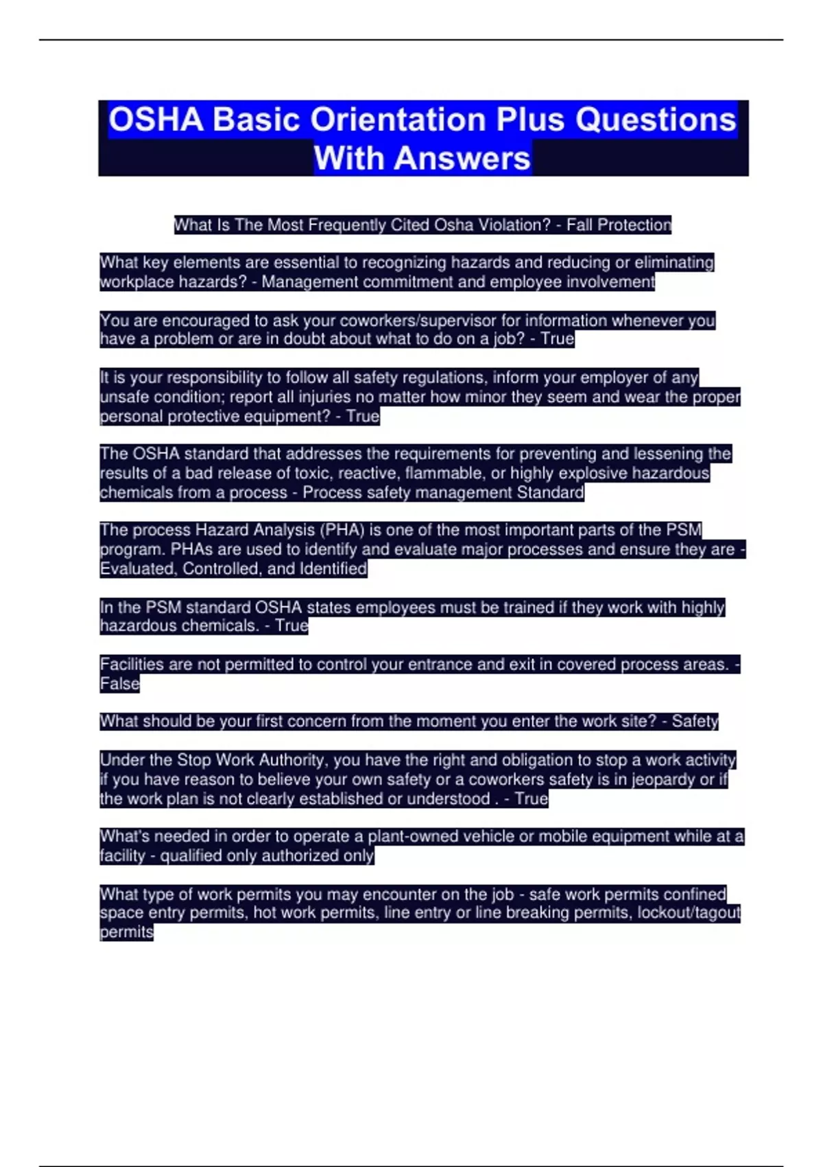 What Is The Most Frequently Cited Osha Violation? - Fall Protection What key elements are essential to recognizing hazards and reducing or eliminating workplace hazards? - Management commitment and employee involvement You are encouraged to ask your coworkers/supervisor for information whenever you have a problem or are in doubt about what to do on a job? - True It is your responsibility to follow all safety regulations, inform your employer of any unsafe condition; report all injuries no matter how minor they seem and wear the proper personal protective equipment? - True The OSHA standard that addresses the requirements for preventing and lessening the results of a bad release of toxic, reactive, flammable, or highly explosive hazardous chemicals from a process - Process safety management Standard The process Hazard Analysis (PHA) is one of the most important parts of the PSM program. PHAs are used to identify and evaluate major processes and ensure they are - Evaluated, Controlled, and Identified In the PSM standard OSHA states employees must be trained if they work with highly hazardous chemicals. - True Facilities are not permitted to control your entrance and exit in covered process areas. - False What should be your first concern from the moment you enter the work site? - Safety Under the Stop Work Authority, you have the right and obligation to stop a work activity if you have reason to believe your own safety or a coworkers safety is in jeopardy or if the work plan is not clearly established or understood . - True What's needed in order to operate a plant-owned vehicle or mobile equipment while at a facility - qualified only authorized only What type of work permits you may encounter on the job - safe work permits confined space entry permits, hot work permits, line entry or line breaking permits, lockout/tagout permits if you are replacing a piece of equipment the new one should be the same as the one being removed. If its not you should find out whether the change was on purpose. what is this called - Management of change Used only where an immediate life threatening hazard exists - Danger Used where immediate non life threatening hazards exist - Warning Sign Used to warn against potential hazards or to caution against unsafe practices - Caution signs Physical devices that are designed to prevent entry into an area where hazards are present. - Barriers Obstacles that discourage the passage of persons or vehicles - Barricade When lifting or setting down a load, bend at the - Knees If you experience pain or discomfort as a result of your work activities, you should do what? - report it to your supervisor as soon as possible What are the most common diseases caused by bloodborne pathogens in the workplace - Human Immunodeficiency, Hepatitis B, Hepatitis C Universal precautions is an infection control approach where you treat all blood and body fluids as if they are known to be infectious for bloodborne pathogens only if the injured person is sick - False What is the least severe rating in the GHS classification system - Four What is the most severe rating in the GHS classification system - One what does Hazard color RED means? - Fire What does Hazard color BLUE means? - Health What does Hazard color YELLOW mean? - Reactivity What does Hazard color WHITE mean? - Personal protection other hazards ans special precautions What does the HMIS color BLUE indicate? - Health What does the HMIS color ORANGE indicate? - Physical hazard What does the HMIS color RED indicate? - Flammability