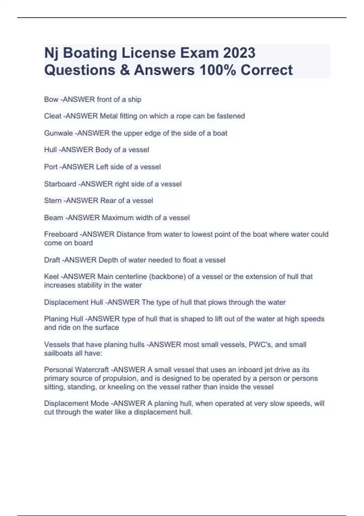 Nj Boating License Exam 2023 Questions & Answers 100% CorrectNj Boating License Exam 2023 Questions & Answers 100% CorrectNj Boating License Exam 2023 Questions & Answers 100% Correct Bow -ANSWER front of a ship Cleat -ANSWER Metal fitting on which a rope can be fastened Gunwale -ANSWER the upper edge of the side of a boat Hull -ANSWER Body of a vessel Port -ANSWER Left side of a vessel Starboard -ANSWER right side of a vessel Stern -ANSWER Rear of a vessel