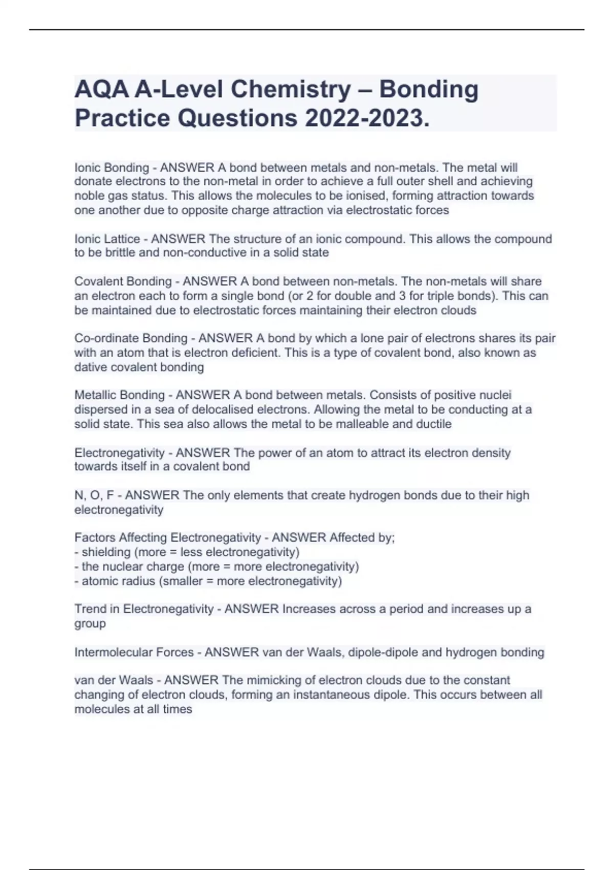 AQA A-Level Chemistry – Bonding Practice Questions .Ionic Bonding - ANSWER A bond between metals and non-metals. The metal will donate electrons to the non-metal in order to achieve a full outer shell and achieving noble gas status. This allows the molecules to be ionised, forming attraction towards one another due to opposite charge attraction via electrostatic forces Ionic Lattice - ANSWER The structure of an ionic compound. This allows the compound to be brittle and non-conductive in a solid state Covalent Bonding - ANSWER A bond between non-metals. The non-metals will share an electron each to form a single bond (or 2 for double and 3 for triple bonds). This can be maintained due to electrostatic forces maintaining their electron clouds Co-ordinate Bonding - ANSWER A bond by which a lone pair of electrons shares its pair with an atom that is electron deficient. This is a type of covalent bond, also known as dative covalent bonding Metallic Bonding - ANSWER A bond between metals. Consists of positive nuclei dispersed in a sea of delocalised electrons. Allowing the metal to be conducting at a solid state. This sea also allows the metal to be malleable and ductile Electronegativity - ANSWER The power of an atom to attract its electron density towards itself in a covalent bond N, O, F - ANSWER The only elements that create hydrogen bonds due to their high electronegativity Factors Affecting Electronegativity - ANSWER Affected by; - shielding (more = less electronegativity) - the nuclear charge (more = more electronegativity) - atomic radius (smaller = more electronegativity) Trend in Electronegativity - ANSWER Increases across a period and increases up a group Intermolecular Forces - ANSWER van der Waals, dipole-dipole and hydrogen bonding van der Waals - ANSWER The mimicking of electron clouds due to the constant changing of electron clouds, forming an instantaneous dipole. This occurs between all molecules at all times Dipole-Dipole - ANSWER The rotation of molecules due to molecules with a constant biased electron cloud. This causes like partial charge repulsion and opposite partial charge attraction. This only occurs between molecules with permanent biased electron clouds Permanent Dipole - ANSWER Biased electron cloud, represented by a lower-case delta Hydrogen Bonding - ANSWER A highly electronegative element will be bonded to hydrogen. This induces a biased electron cloud, giving the hydrogen a partially positive charge. This hydrogen then has opposite charge attraction between its partial positive charge and lone pairs on other molecules. This only occurs if the hydrogen is bonded to N, O or F. Note: this is why oxygen has a high surface tension