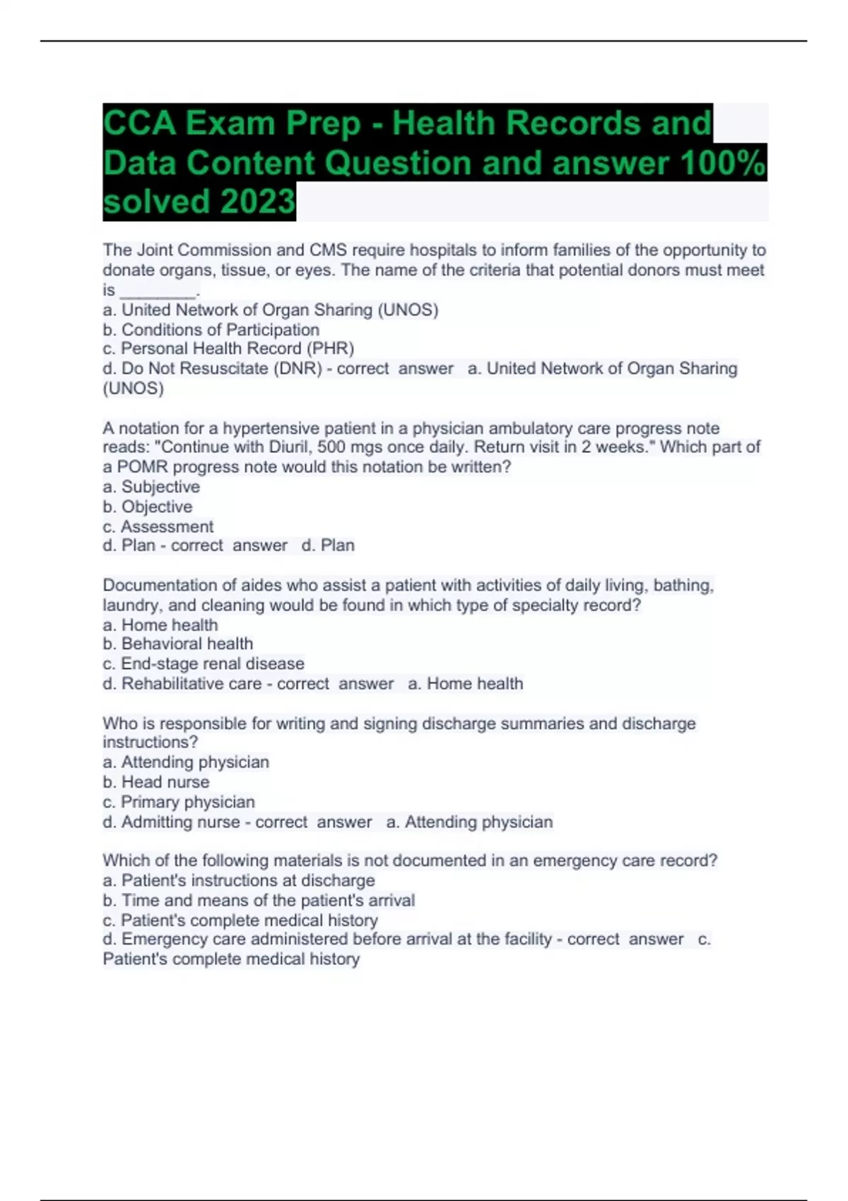 CCA Exam Prep - Health Records and Data Content Question and answer 100% solved 2023The Joint Commission and CMS require hospitals to inform families of the opportunity to donate organs, tissue, or eyes. The name of the criteria that potential donors must meet is ________. a. United Network of Organ Sharing (UNOS) b. Conditions of Participation c. Personal Health Record (PHR) d. Do Not Resuscitate (DNR) a. United Network of Organ Sharing (UNOS) A notation for a hypertensive patient in a physician ambulatory care progress note reads: "Continue with Diuril, 500 mgs once daily. Return visit in 2 weeks." Which part of a POMR progress note would this notation be written? a. Subjective b. Objective c. Assessment d. Plan d. Plan Documentation of aides who assist a patient with activities of daily living, bathing, laundry, and cleaning would be found in which type of specialty record? a. Home health b. Behavioral health c. End-stage renal disease d. Rehabilitative care a. Home health Who is responsible for writing and signing discharge summaries and discharge instructions? a. Attending physician b. Head nurse c. Primary physician d. Admitting nurse a. Attending physician Which of the following materials is not documented in an emergency care record? a. Patient's instructions at discharge b. Time and means of the patient's arrival c. Patient's complete medical history d. Emergency care administered before arrival at the facility c. Patient's complete medical history All documentation entered in the medical record relating to the patient's diagnosis and treatment is considered as this type of data: a. Clinical b. Identification c. Secondary d. Financial a. clinical Which of the following elements is not a component of most patient records? a. Patient identification b. Clinical history c. Financial information d. Test results c. financial information Which of the following would not be found in a medical history? a. Chief complaint b. Vital signs c. Present illness d. Review of systems b. vital signs Identify where the following information would be found in the acute-care record: "PA and Lateral Chest: The lungs are clear. The heart and mediastinum are normal in size and configuration. There are minor degenerative changes of the lower thoracic spine." a. Medical laboratory report b. Physical examination c. Physician progress note d. Radiography report d. Radiography report