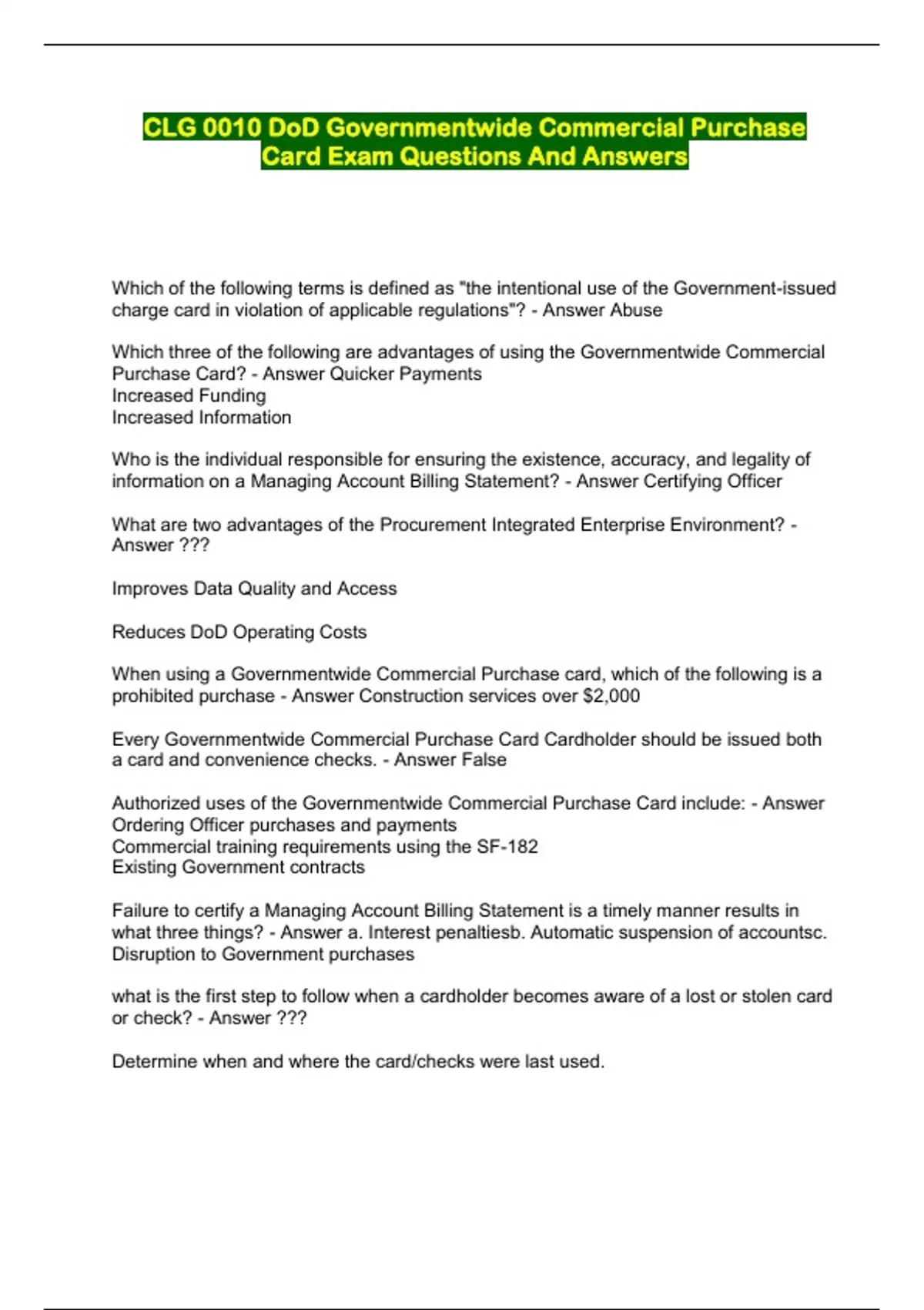CLG 0010 DoD Governmentwide Commercial Purchase Card Exam Questions And Answers