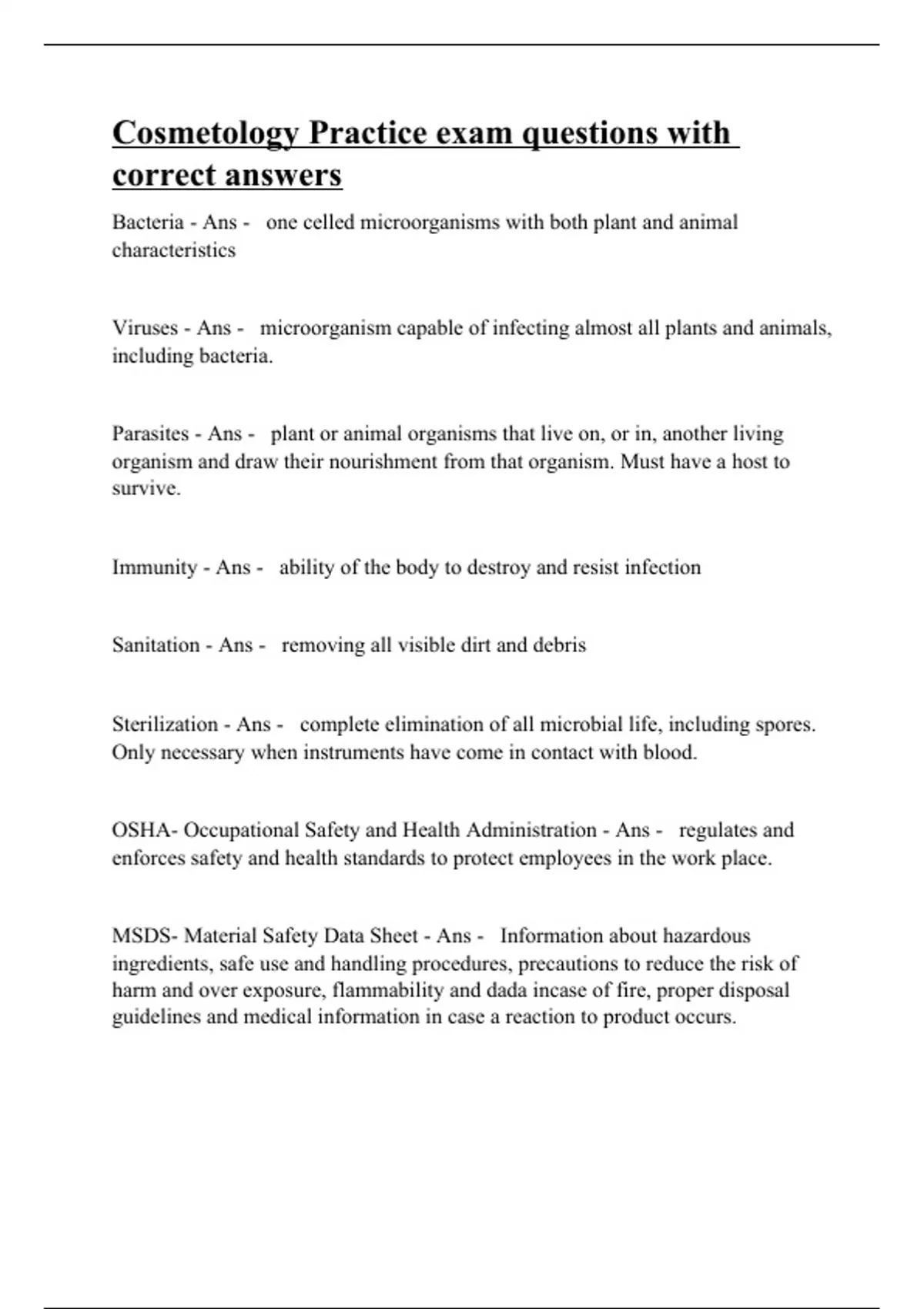 Bacteria - Ans - one celled microorganisms with both plant and animal characteristics Viruses - Ans - microorganism capable of infecting almost all plants and animals, including bacteria. Parasites - Ans - plant or animal organisms that live on, or in, another living organism and draw their nourishment from that organism. Must have a host to survive. Immunity - Ans - ability of the body to destroy and resist infection Sanitation - Ans - removing all visible dirt and debris Sterilization - Ans - complete elimination of all microbial life, including spores. Only necessary when instruments have come in contact with blood. OSHA- Occupational Safety and Health Administration - Ans - regulates and enforces safety and health standards to protect employees in the work place.