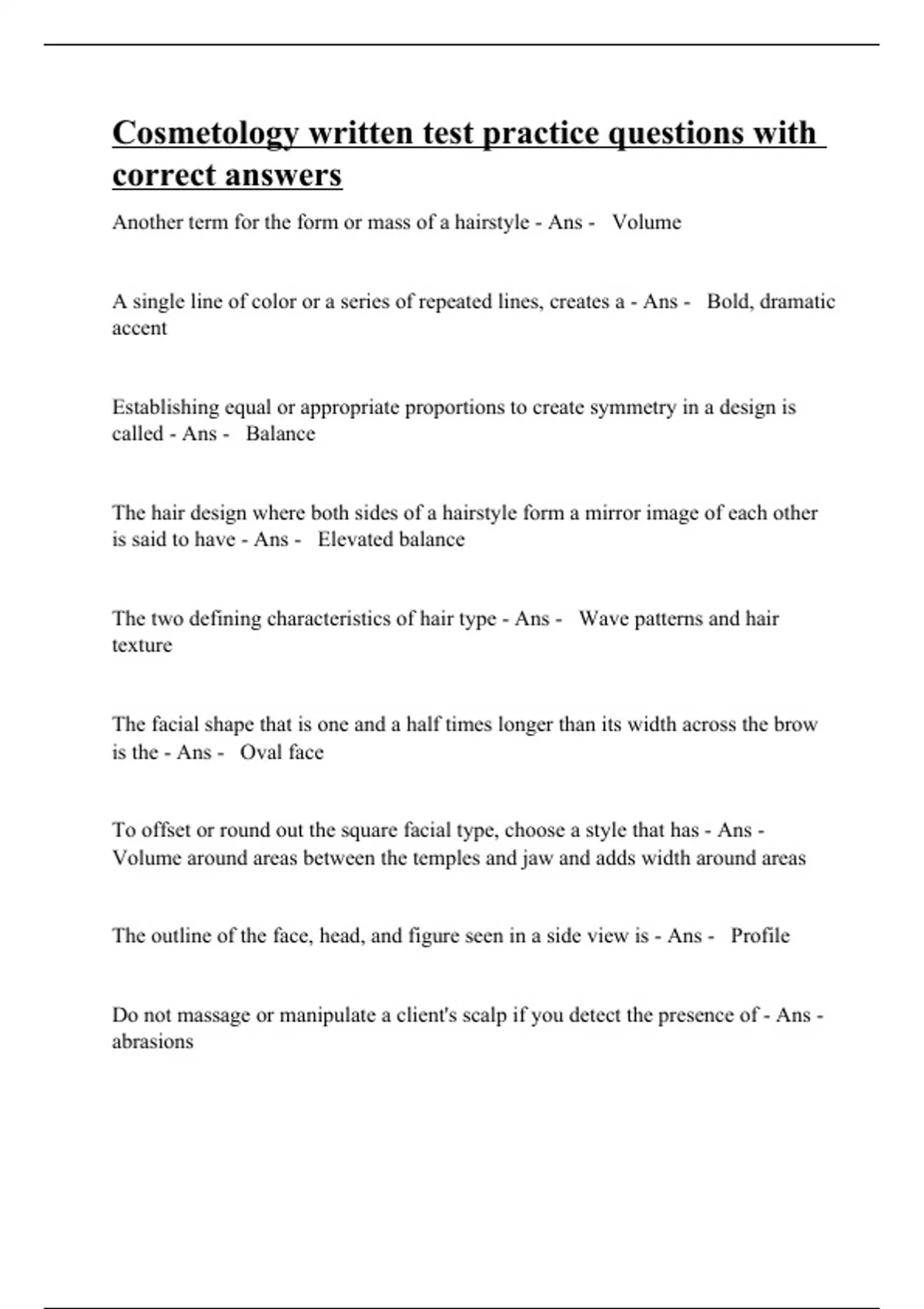 Another term for the form or mass of a hairstyle - Ans - Volume A single line of color or a series of repeated lines, creates a - Ans - Bold, dramatic accent Establishing equal or appropriate proportions to create symmetry in a design is called - Ans - Balance The hair design where both sides of a hairstyle form a mirror image of each other is said to have - Ans - Elevated balance The two defining characteristics of hair type - Ans - Wave patterns and hair texture The facial shape that is one and a half times longer than its width across the brow is the - Ans - Oval face To offset or round out the square facial type, choose a style that has - Ans - Volume around areas between the temples and jaw and adds width around areas The outline of the face, head, and figure seen in a side view is - Ans - Profile Do not massage or manipulate a client's scalp if you detect the presence of - Ans - abrasions