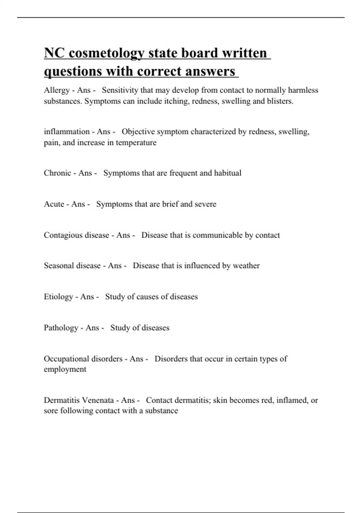 Allergy - Ans - Sensitivity that may develop from contact to normally harmless substances. Symptoms can include itching, redness, swelling and blisters. inflammation - Ans - Objective symptom characterized by redness, swelling, pain, and increase in temperature Chronic - Ans - Symptoms that are frequent and habitual Acute - Ans - Symptoms that are brief and severe Contagious disease - Ans - Disease that is communicable by contact Seasonal disease - Ans - Disease that is influenced by weather Etiology - Ans - Study of causes of diseases Pathology - Ans - Study of diseases Occupational disorders - Ans - Disorders that occur in certain types of employment Dermatitis Venenata - Ans - Contact dermatitis; skin becomes red, inflamed, or sore following contact with a substance Irritant contact dermatitis - Ans - Caused by contact with