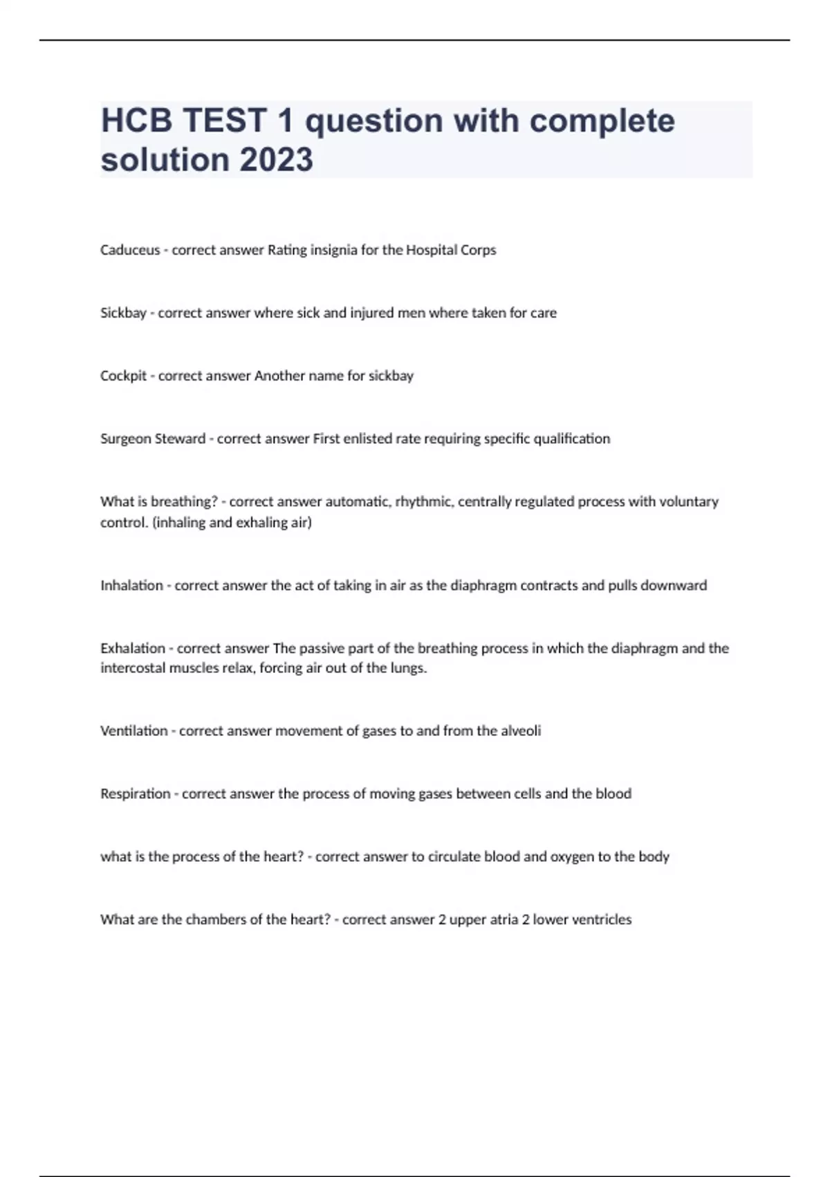 HCB TEST 1 question with complete solution 2023Caduceus - correct answer Rating insignia for the Hospital Corps Sickbay - correct answer where sick and injured men where taken for care Cockpit - correct answer Another name for sickbay Surgeon Steward - correct answer First enlisted rate requiring specific qualification What is breathing? - correct answer automatic, rhythmic, centrally regulated process with voluntary control. (inhaling and exhaling air) Inhalation - correct answer the act of taking in air as the diaphragm contracts and pulls downward Exhalation - correct answer The passive part of the breathing process in which the diaphragm and the intercostal muscles relax, forcing air out of the lungs. Ventilation - correct answer movement of gases to and from the alveoli Respiration - correct answer the process of moving gases between cells and the blood what is the process of the heart? - correct answer to circulate blood and oxygen to the body What are the chambers of the heart? - correct answer 2 upper atria 2 lower ventricles
