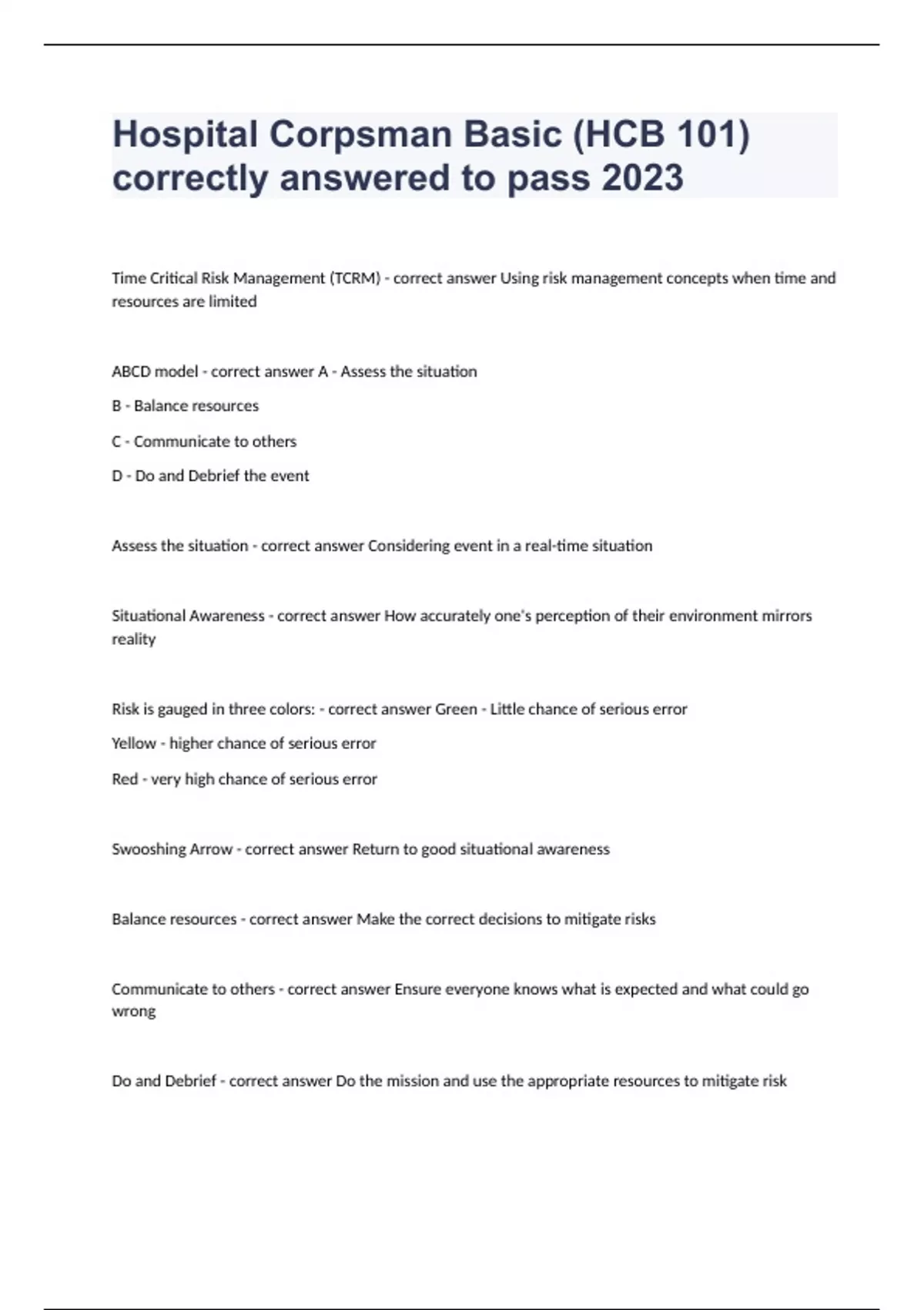 Hospital Corpsman Basic (HCB 101) correctly answered to pass 2023Time Critical Risk Management (TCRM) - correct answer Using risk management concepts when time and resources are limited ABCD model - correct answer A - Assess the situation B - Balance resources C - Communicate to others D - Do and Debrief the event Assess the situation - correct answer Considering event in a real-time situation Situational Awareness - correct answer How accurately one's perception of their environment mirrors reality Risk is gauged in three colors: - correct answer Green - Little chance of serious error Yellow - higher chance of serious error Red - very high chance of serious error Swooshing Arrow - correct answer Return to good situational awareness Balance resources - correct answer Make the correct decisions to mitigate risks Communicate to others - correct answer Ensure everyone knows what is expected and what could go wrong Do and Debrief - correct answer Do the mission and use the appropriate resources to mitigate risk