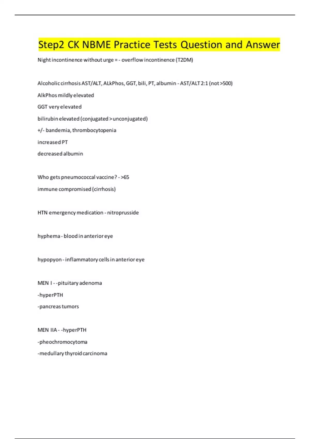 Night incontinence without urge = - overflow incontinence (T2DM) Alcoholic cirrhosis AST/ALT, ALkPhos, GGT, bili, PT, albumin - AST/ALT 2:1 (not 500) AlkPhos mildly elevated GGT very elevated bilirubin elevated (conjugated unconjugated) +/- bandemia, thrombocytopenia increased PT decreased albumin Who gets pneumococcal vaccine? - 65 immune compromised (cirrhosis) HTN emergency medication - nitroprusside hyphema - blood in anterior eye hypopyon - inflammatory cells in anterior eye MEN I - -pituitary adenoma -hyperPTH -pancreas tumors MEN IIA - -hyperPTH -pheochromocytoma -medullary thyroid carcinoma MEN IIB - -pheochromocytoma -medullary thyroid carcinoma -marfanoid/mucosal neuromas
