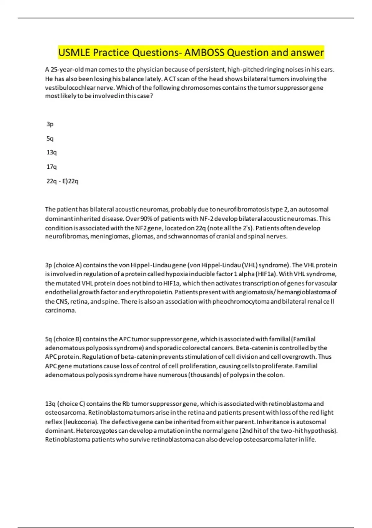 A 25-year-old man comes to the physician because of persistent, high-pitched ringing noises in his ears. He has also been losing his balance lately. A CT scan of the head shows bilateral tumors involving the vestibulocochlear nerve. Which of the following chromosomes contains the tumor suppressor gene most likely to be involved in this case? 3p 5q 13q 17q 22q - E)22q The patient has bilateral acoustic neuromas, probably due to neurofibromatosis type 2, an autosomal dominant inherited disease. Over 90% of patients with NF-2 develop bilateral acoustic neuromas. This condition is associated with the NF2 gene, located on 22q (note all the 2's). Patients often develop neurofibromas, meningiomas, gliomas, and schwannomas of cranial and spinal nerves. 3p (choice A) contains the von Hippel-Lindau gene (von Hippel-Lindau (VHL) syndrome). The VHL protein is involved in regulation of a protein called hypoxia inducible factor 1 alpha (HIF1a). With VHL syndrome, the mutated VHL protein does not bind to HIF1a, which then activates transcription of genes for vascular endothelial growth factor and erythropoietin. Patients present with angiomatosis/ hemangioblastoma of the CNS, retina, and spine. There is also an association with pheochromocytoma and bilateral renal cell carcinoma. 5q (choice B) contains the APC tumor suppressor gene, which is associated with familial (Familial adenomatous polyposis syndrome) and sporadic colorectal cancers. Beta-catenin is controlled by the APC protein. Regulation of beta-catenin prevents stimulation of cell division and cell overgrowth. Thus APC gene mutations cause loss of control of cell proliferation, causing cells to proliferate. Familial adenomatous polyposis syndrome have numerous (thousands) of polyps in the colon. 13q (choice C) contains the Rb tumor suppressor gene, which is associated with retinoblastoma and osteosarcoma. Retinoblastoma tumors arise in the retina and patients present with loss of the red light reflex (leukocoria). The defective gene can be inherited from either parent. Inheritance is autosomal dominant. Heterozygotes can develop a mutation in the normal gene (2nd hit of the two-hit hypothesis). Retinoblastoma patients who survive retinoblastoma can also develop osteosarcoma later in life. 17q (choice D) contains the NF-1 tumor suppressor gene, which is associated with neurofibromatosis type I . Patients present with freckling of the skin (café au lait spots), neurofibromas, Lisch nodules, and increased risk for astrocytomas. An investigator is studying a strain of bacteria that retains a blue color after crystal violet dye and acetone are applied. The bacteria are inoculated in a petri dish containing hypotonic saline. After the addition of an antibiotic, the bacteria swell and rupture. This antibiotic most likely belongs to which of the following cases? A) Macrolide B) Cephalosporin C) Fluoroquinolone D) Sulfonamide E) Tetracycline - B) Cephalosporin A 22-yo woman with T1DM and mild asthma comes to the physician for a follow-up examination. She has had several episodes of sweating, dizziness, and nausea in the past 2-mo that occurs during the day and always resolved after she drinks orange juice. She is compliant with her diet and insulin regimen. The physician recommends LOWERING HER INSULIN DOSE in certain situations. The recommendation is most important in which of the following situations? A) During a viral infection B) After large meal C) Before exercise D) After a stressful exam E) Before using an albuterol inhaler F) During pregnancy - C) Before exercise The patient should lower her insulin dose before exercise because exertion can cause hypoglycemia.