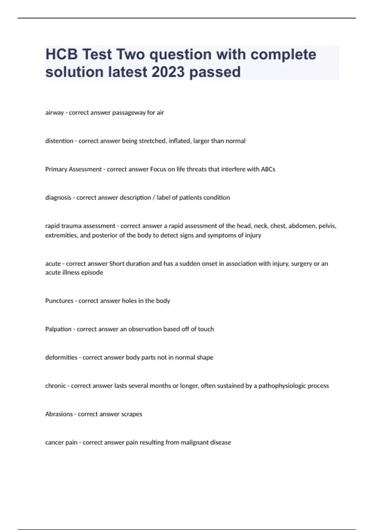 HCB Test Two question with complete solution latest 2023 passed airway - correct answer passageway for air distention - correct answer being stretched, inflated, larger than normal Primary Assessment - correct answer Focus on life threats that interfere with ABCs diagnosis - correct answer description / label of patients condition rapid trauma assessment - correct answer a rapid assessment of the head, neck, chest, abdomen, pelvis, extremities, and posterior of the body to detect signs and symptoms of injury acute - correct answer Short duration and has a sudden onset in association with injury, surgery or an acute illness episode Punctures - correct answer holes in the body Palpation - correct answer an observation based off of touch deformities - correct answer body parts not in normal shape chronic - correct answer lasts several months or longer, often sustained by a pathophysiologic process Abrasions - correct answer scrapes cancer pain - correct answer pain resulting from malignant disease