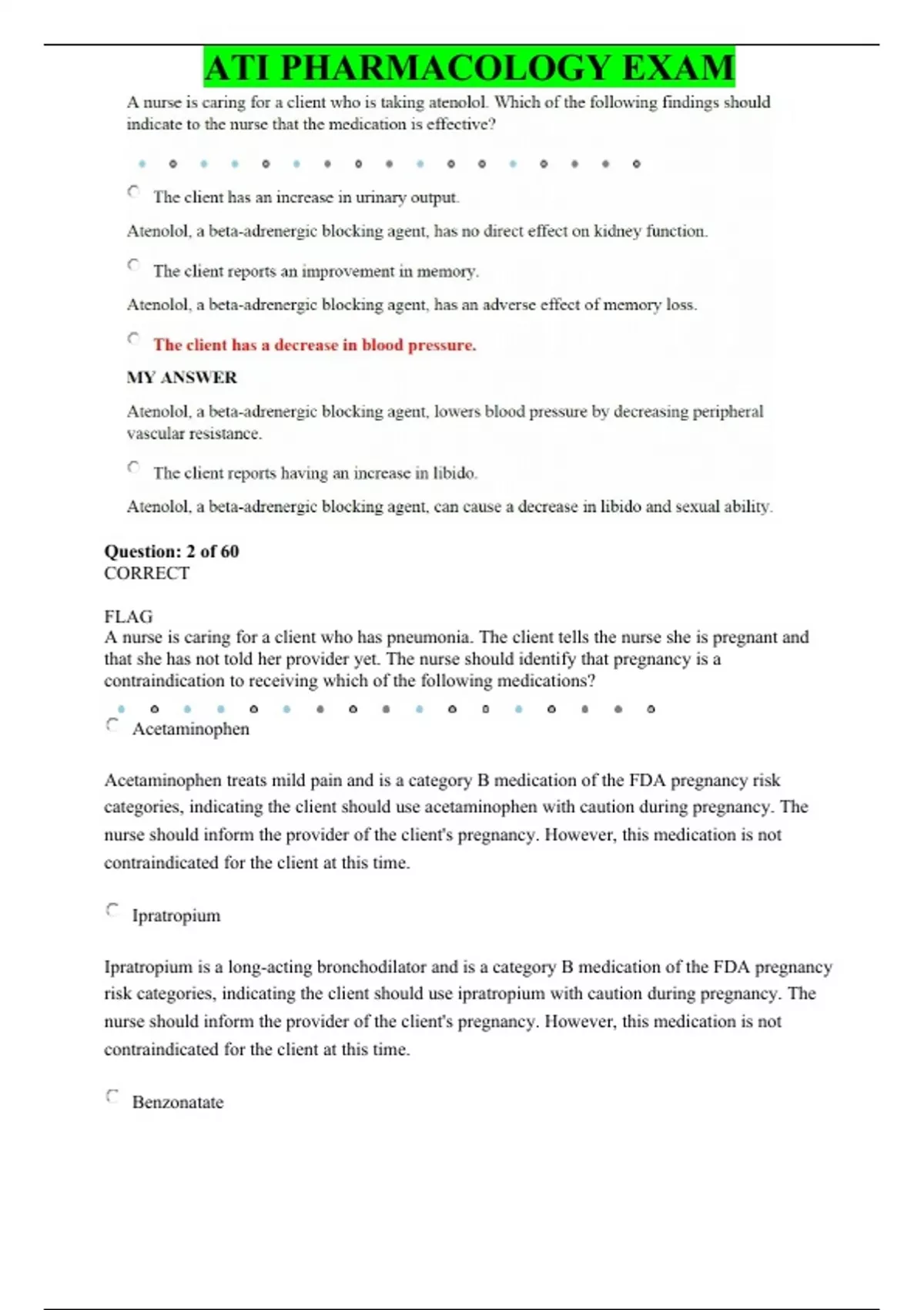 ATI PHARMACOLOGY EXAM Question: 2 of 60 CORRECT FLAG A nurse is caring for a client who has pneumonia. The client tells the nurse she is pregnant and that she has not told her provider yet. The nurse should identify that pregnancy is a contraindication to receiving which of the following medications? Acetaminophen Acetaminophen treats mild pain and is a category B medication of the FDA pregnancy risk categories, indicating the client should use acetaminophen with caution during pregnancy. The nurse should inform the provider of the client's pregnancy. However, this medication is not contraindicated for the client at this time. Ipratropium Ipratropium is a long-acting bronchodilator and is a category B medication of the FDA pregnancy risk categories, indicating the client should use ipratropium with caution during pregnancy. The nurse should inform the provider of the client's pregnancy. However, this medication is not contraindicated for the client at this time. Benzonatate