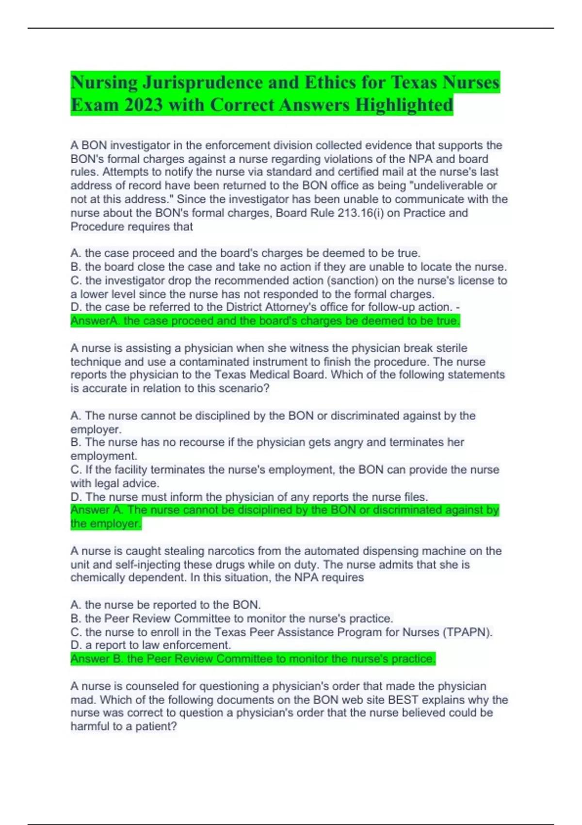 Nursing Jurisprudence and Ethics for Texas Nurses Exam 2023 with Correct Answers Highlighted A BON investigator in the enforcement division collected evidence that supports the BON's formal charges against a nurse regarding violations of the NPA and board rules. Attempts to notify the nurse via standard and certified mail at the nurse's last address of record have been returned to the BON office as being "undeliverable or not at this address." Since the investigator has been unable to communicate with the nurse about the BON's formal charges, Board Rule 213.16(i) on Practice and Procedure requires that A. the case proceed and the board's charges be deemed to be true. B. the board close the case and take no action if they are unable to locate the nurse. C. the investigator drop the recommended action (sanction) on the nurse's license to a lower level since the nurse has not responded to the formal charges. D. the case be referred to the District Attorney's office for follow-up action. - AnswerA. the case proceed and the board's charges be deemed to be true. A nurse is assisting a physician when she witness the physician break sterile technique and use a contaminated instrument to finish the procedure. The nurse reports the physician to the Texas Medical Board. Which of the following statements is accurate in relation to this scenario? A. The nurse cannot be disciplined by the BON or discriminated against by the employer. B. The nurse has no recourse if the physician gets angry and terminates her employment. C. If the facility terminates the nurse's employment, the BON can provide the nurse with legal advice. D. The nurse must inform the physician of any reports the nurse files. Answer A. The nurse cannot be disciplined by the BON or discriminated against by the employer. A nurse is caught stealing narcotics from the automated dispensing machine on the unit and self-injecting these drugs while on duty. The nurse admits that she is chemically dependent. In this situation, the NPA requires A. the nurse be reported to the BON. B. the Peer Review Committee to monitor the nurse's practice. C. the nurse to enroll in the Texas Peer Assistance Program for Nurses (TPAPN). D. a report to law enforcement. Answer B. the Peer Review Committee to monitor the nurse's practice. A nurse is counseled for questioning a physician's order that made the physician mad. Which of the following documents on the BON web site BEST explains why the nurse was correct to question a physician's order that the nurse believed could be harmful to a patient?