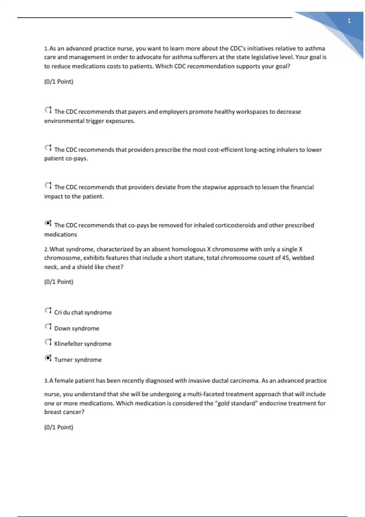 1. As an advanced practice nurse, you want to learn more about the CDC’s initiatives relative to asthma care and management in order to advocate for asthma sufferers at the state legislative level. Your goal is to reduce medications costs to patients. Which CDC recommendation supports your goal? (0/1 Point) The CDC recommends that payers and employers promote healthy workspaces to decrease environmental trigger exposures. The CDC recommends that providers prescribe the most cost-efficient long-acting inhalers to lower patient co-pays. The CDC recommends that providers deviate from the stepwise approach to lessen the financial impact to the patient. The CDC recommends that co-pays be removed for inhaled corticosteroids and other prescribed medications 2. What syndrome, characterized by an absent homologous X chromosome with only a single X chromosome, exhibits features that include a short stature, total chromosome count of 45, webbed neck, and a shield like chest? (0/1 Point) Cri du chat syndrome Down syndrome Klinefelter syndrome Turner syndrome 3. A female patient has been recently diagnosed with invasive ductal carcinoma. As an advanced practice nurse, you understand that she will be undergoing a multi-faceted treatment approach that will include one or more medications. Which medication is considered the “gold standard” endocrine treatment for breast cancer? (0/1 Point) Fulvestrant (Faslodex), an antiestrogen indicated for metastatic estrogen receptor-positive breast cancer in post-menopausal women Tamoxifen (Nolvadex), a prodrug that must be converted to active metabolites in order to block estrogen receptors in breast tissue Trastuzumab (Herceptin), a monoclonal antibody approved for HER2-positive metastatic breast cancer Lapatinib (Tykerb), an oral inhibitor of HER2 tyrosine kinase and EGFR tyrosine kinase, resulting in apoptosis and suppression of tumor cell growth 4. A patient with T2DM comes to the clinic after reading about metformin in a magazine. Which of the following conditions that the patient also has would be a contraindication to taking metformin? (0/1 Point) Renal disease Congestive heart failure Rheumatoid arthritis Hepatitic C virus 5. A newborn born with hypoplastic left heart syndrome is receiving intravenous infusion of prostaglandin. This medication is essential in keeping which two vessels patent? (0/1 Point) Foramen ovale Pulmonary vein Ductus arteriosus Hepatic portal vein 6. A patient in the clinic reports fever, arthralgia, a rash, and nosebleeds. What other information should the healthcare professional elicit from this patient? (0/1 Point) Family history of Marfan’s disease History of a recent bacterial infection History of any recent chest trauma Any illnesses in family members 7. Urinalysis is ordered for a diabetic patient. The results are 4+ ketones, trace leukocytes, negative nitrates, and red blood cells. Which of the following actions would the health practitioner take next? (1/1 Point) Order an ultrasound of the kidneys to rule out sub-acute renal failure Check the patient glucose level ANS: B Check the patient’s blood glucose . Presence of 4+ ketones in the urine indicates sever hyperglycemia so the health professional should further assess the patient’s status. Order a 24-hour urine test for microalbumin Assess for a history of illicit drug or alcohol use 8. A 56-year-old diabetic patient has not taken his insulin in 4 days due to him” feeling well without it”. He is admitted to the ED with an elevated blood sugar. What electrolyte should be assessed first? (1/1 Point) Calcium Sodium Potassium Insulin facilitates the intracellular transport of potassium, phosphate, and magnesium. Without insulin, potassium does not get transported to the intracellular environment and the serum potassium will rise. Chloride 9. A patient has a pulmonary capillary wedge pressure of 30mmHg. What assessment finding by the healthcare professional would be most consistent with this reading? (1/1 Point) Pink, frothy sputum Pulmonary edema usually begins to develop at a pulmonary capillary wedge pressure or left atrial pressure of 20 mmHg. Signs of pulmonary edema include dyspnea, hypoxemia, and increased work of breathing. Physical examination may reveal inspiratory crackles (rales), dullness to percussion over the lung bases, and evidence of ventricular dilation (S3 gallop and cardiomegaly). In severe edema, pink, frothy sputum is expectorated, hypoxemia worsens, and hypoventilation with hypercapnia may develop. Normal lung sounds Rhonchi Eupnea 10. A child has a disorder that resulted in the failure of bones to ossify, resulting in soft bones and skeletal deformity. What treatment plan does the healthcare professional discuss with the parents? (1/1 Point) Extremely careful handling Increasing vitamin D intake This description characterizes rickets. Growing bone fails to mineralize because of a problem with vitamin D intake, absorption, or excretion. Treatment includes supplemental vitamin D. Extremely careful handling would be appropriate for osteogenesis imperfecta. Revascularization procedures would benefit a child with osteochondrosis. Containment and motion are the principles of treating Legg-Calvé-Perthes disease. Revascularization Containment and motion therapy 11. A health professional is caring for a child that was sexually abused. She is trying to decide which medication option she should provide to the child. What should she know before providing the treatment option? (1/1 Point) The age and weight of the child A Treatment depends on the age and weight of the child The race of the child The height of the child The developmental stage 12. The physician prescribes the patient a loop diuretic. As the nurse you know that this type of diuretic causes diuresis by affecting which structure in the nephron? (0/1 Point) Distal convoluted tubule Descending limb of the loop of Henle Proximal convoluted tubule Ascending limb of the loop of Henle 13. A pa