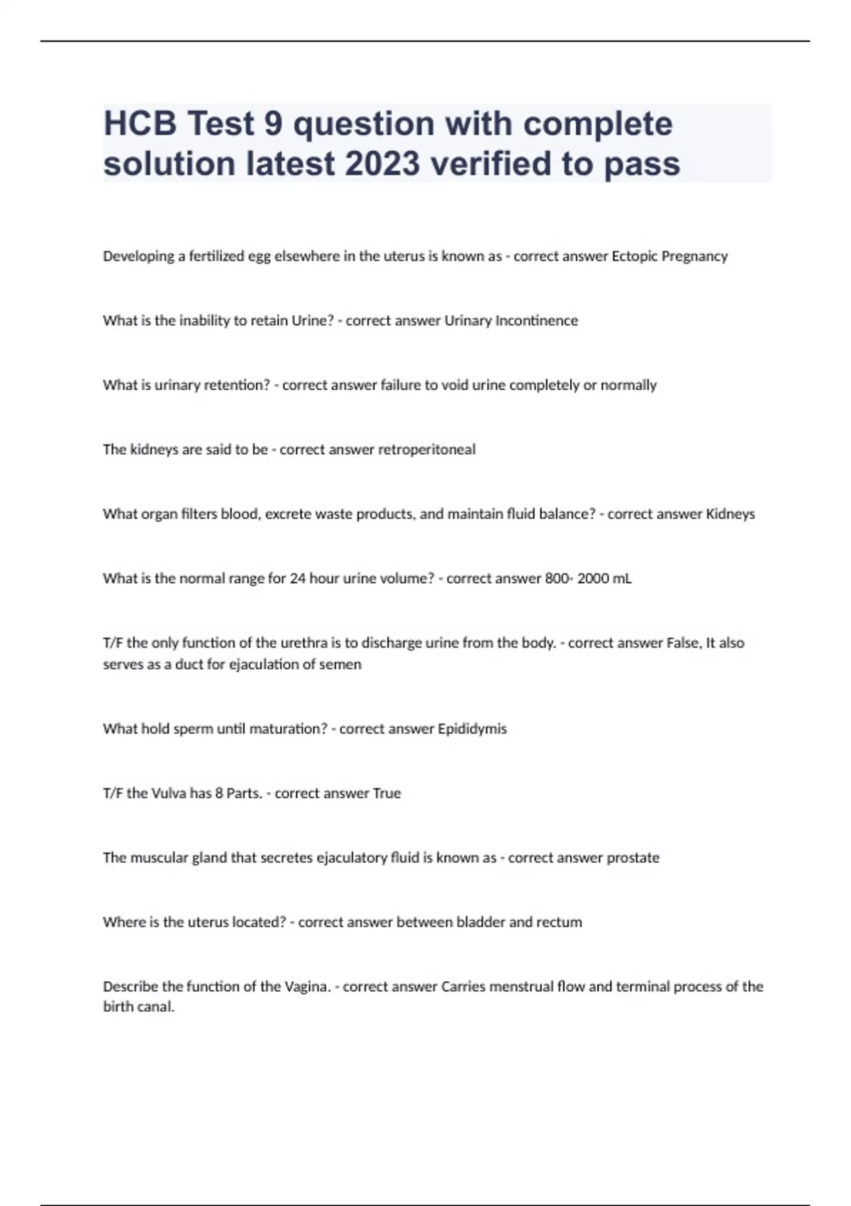 HCB Test 9 question with complete solution latest 2023 verified to passDeveloping a fertilized egg elsewhere in the uterus is known as - correct answer Ectopic Pregnancy What is the inability to retain Urine? - correct answer Urinary Incontinence What is urinary retention? - correct answer failure to void urine completely or normally The kidneys are said to be - correct answer retroperitoneal What organ filters blood, excrete waste products, and maintain fluid balance? - correct answer Kidneys What is the normal range for 24 hour urine volume? - correct answer 800- 2000 mL T/F the only function of the urethra is to discharge urine from the body. - correct answer False, It also serves as a duct for ejaculation of semen What hold sperm until maturation? - correct answer Epididymis T/F the Vulva has 8 Parts. - correct answer True The muscular gland that secretes ejaculatory fluid is known as - correct answer prostate Where is the uterus located? - correct answer between bladder and rectum Describe the function of the Vagina. - correct answer Carries menstrual flow and terminal process of the birth canal. What hormones do the ovaries produce? - correct answer estrogen and progesterone ______ is the second most common infection in the body. - correct answer Urinary Tract Infection (UTI) What is the common name for Renal Calculi? - correct answer kidney stones Inflammation of the female reproductive tract is known as... - correct answer Pelvic Inflammatory Disease (PID) Where is the most common place to insert a urinary catheter? - correct answer Urethra Foley catheter is also known as - correct answer Indwelling catheter What is a common indication for an indwelling catheter? - correct answer the need for accurate measurement of urinary output After a catheter is inserted into the patient where should the drainage bag be paced? - correct answer Below the level of the bladder What is the preferred position when inserting a catheter in a male patient? - correct answer Supine or sitting position What is the preferred position when inserting a catheter in a female patient? - correct answer Dorsal recumbent The most serious complication of vaginal bleeding is - correct answer Hypovolemic shock T/F Pregnant patients have a pulse that is 10 to 15 bpm faster than a non-pregnant female. - correct answer True