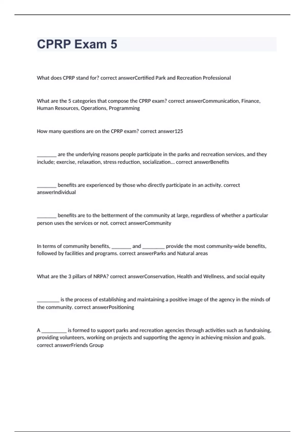 What does CPRP stand for? Certified Park and Recreation Professional What are the 5 categories that compose the CPRP exam? Communication, Finance, Human Resources, Operations, Programming How many questions are on the CPRP exam? 125 _______ are the underlying reasons people participate in the parks and recreation services, and they include; exercise, relaxation, stress reduction, socialization... Benefits _______ benefits are experienced by those who directly participate in an activity. Individual _______ benefits are to the betterment of the community at large, regardless of whether a particular person uses the services or not. Community In terms of community benefits, _______ and ________ provide the most community-wide benefits, followed by facilities and programs. Parks and Natural areas What are the 3 pillars of NRPA? Conservation, Health and Wellness, and social equity ________ is the process of establishing and maintaining a positive image of the agency in the minds of the community. Positioning A _________ is formed to support parks and recreation agencies through activities such as fundraising, providing volunteers, working on projects and supporting the agency in achieving mission and goals. Friends Group Most friends groups are established as a _______ 501 (c) 3