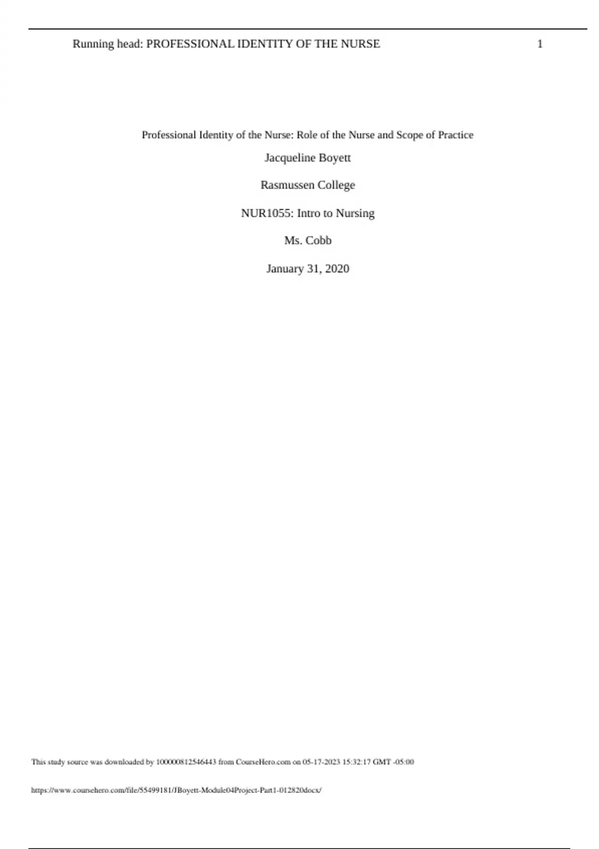 NUR 1055 JBoyett_Module04Project-Part1/Professional Identity of the Nurse: Role of the Nurse and Scope of Practice