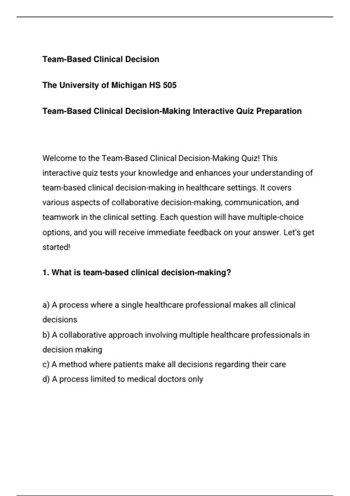 HS 505 Team-Based Clinical Decision-Making Interactive Quiz Preparation