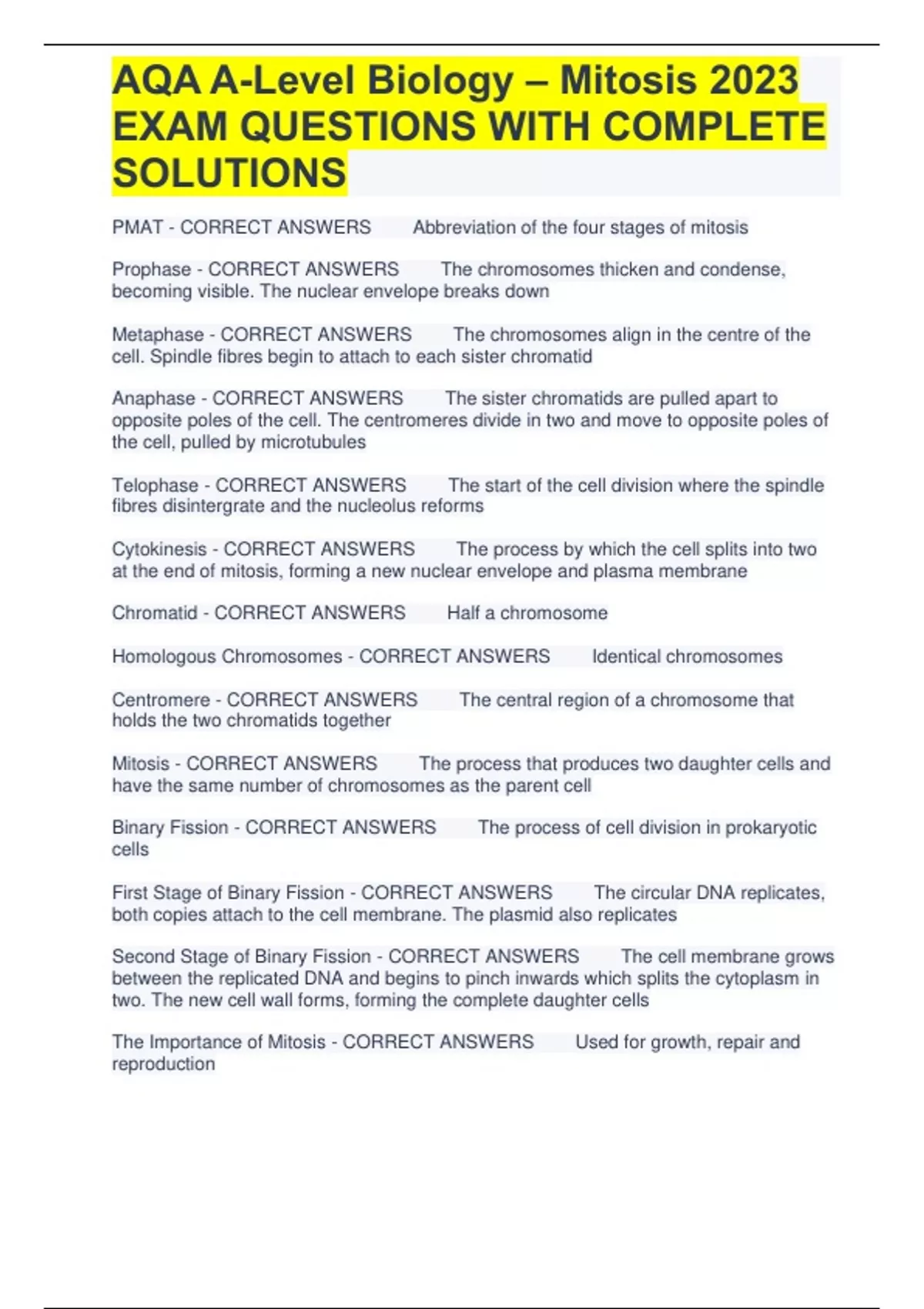 AQA A-Level Biology – Mitosis 2023 EXAM QUESTIONS WITH COMPLETE SOLUTIONS PMAT - CORRECT ANSWERS Abbreviation of the four stages of mitosis Prophase - CORRECT ANSWERS The chromosomes thicken and condense, becoming visible. The nuclear envelope breaks down Metaphase - CORRECT ANSWERS The chromosomes align in the centre of the cell. Spindle fibres begin to attach to each sister chromatid Anaphase - CORRECT ANSWERS The sister chromatids are pulled apart to opposite poles of the cell. The centromeres divide in two and move to opposite poles of the cell, pulled by microtubules Telophase - CORRECT ANSWERS The start of the cell division where the spindle fibres disintergrate and the nucleolus reforms Cytokinesis - CORRECT ANSWERS The process by which the cell splits into two at the end of mitosis, forming a new nuclear envelope and plasma membrane Chromatid - CORRECT ANSWERS Half a chromosome Homologous Chromosomes - CORRECT ANSWERS Identical chromosomes Centromere - CORRECT ANSWERS The central region of a chromosome that holds the two chromatids together Mitosis - CORRECT ANSWERS The process that produces two daughter cells and have the same number of chromosomes as the parent cell Binary Fission - CORRECT ANSWERS The process of cell division in prokaryotic cells First Stage of Binary Fission - CORRECT ANSWERS The circular DNA replicates, both copies attach to the cell membrane. The plasmid also replicates Second Stage of Binary Fission - CORRECT ANSWERS The cell membrane grows between the replicated DNA and begins to pinch inwards which splits the cytoplasm in two. The new cell wall forms, forming the complete daughter cells The Importance of Mitosis - CORRECT ANSWERS Used for growth, repair and reproduction Interphase - CORRECT ANSWERS The DNA replication that occurs before mitosis. This takes up 90% of the cell cycle Growth 1 Stage - CORRECT ANSWERS The first part of interphase. Parts of the cell reproduce, such as organelles and the cytoplasm Synthesis Stage - CORRECT ANSWERS The second part of interphase. The DNA packaged into chromosomes replicate. This forms sister chromatids Growth 2 Stage - CORRECT ANSWERS The final part of interphase. The stage by which the cell checks that the replication process has been a success before the cell undergoes mitosis, further growth may occur to ensure everything has been replicated correctly Chemotherapy - CORRECT ANSWERS A type of cancer treatment that; prevents DNA replication or inhibits metaphase by damaging spindle fibres so the chromosomes cannot travel to the poles of the cell Cancerous - CORRECT ANSWERS What a tumour is called when it goes from benign to malignant Benign - CORRECT ANSWERS Where a tumour grows to a certain size and then stops growing any further; does not spread Malignant - CORRECT ANSWERS A tumour that can spread around the body, is often life threatening The Cell Cycle - CORRECT ANSWERS The process of interphase, mitosis and cytokinesis