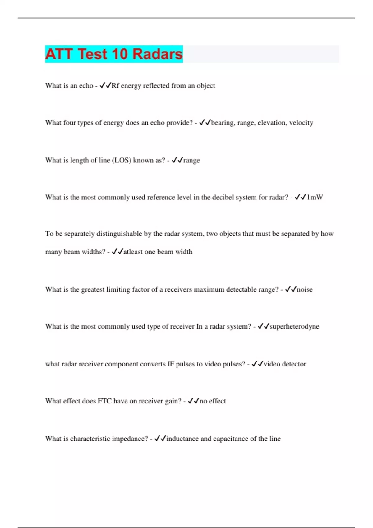 ATT Test 10 Radars | 110 Questions with 100% Correct Answers | Verified