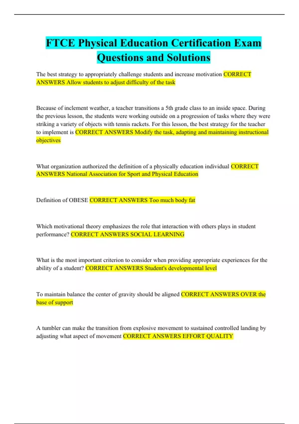 FTCE Physical Education Certification Exam Questions and Solutions The best strategy to appropriately challenge students and increase motivation Because of inclement weather, a teacher transitions a 5th grade class to an inside space. During the previous lesson, the students were working outside on a progression of tasks where they were striking a variety of objects with tennis rackets. For this lesson, the best strategy for the teacher to implement is What organization authorized the definition of a physically education individual Definition of OBESE Which motivational theory emphasizes the role that interaction with others plays in student performance? What is the most important criterion to consider when providing appropriate experiences for the ability of a student? To maintain balance the center of gravity should be aligned A tumbler can make the transition from explosive movement to sustained controlled landing by adjusting what aspect of movement What movement concept is included in estimating the difference in force required to throw a ball 10 feet or 50 feet As students put DANCE movements together, the teacher should instruct them in the concept of Which are classified as LOCOMOTOR Skills MANIPULATIVE skills NONLOCOMOTOR SKILLS A PE teacher is teaching a 7th grade student a modified version of flag football. Which of the following sequentially progressive activities should the teacher follow? CLOSED skill How to help a student hit the ball to left field