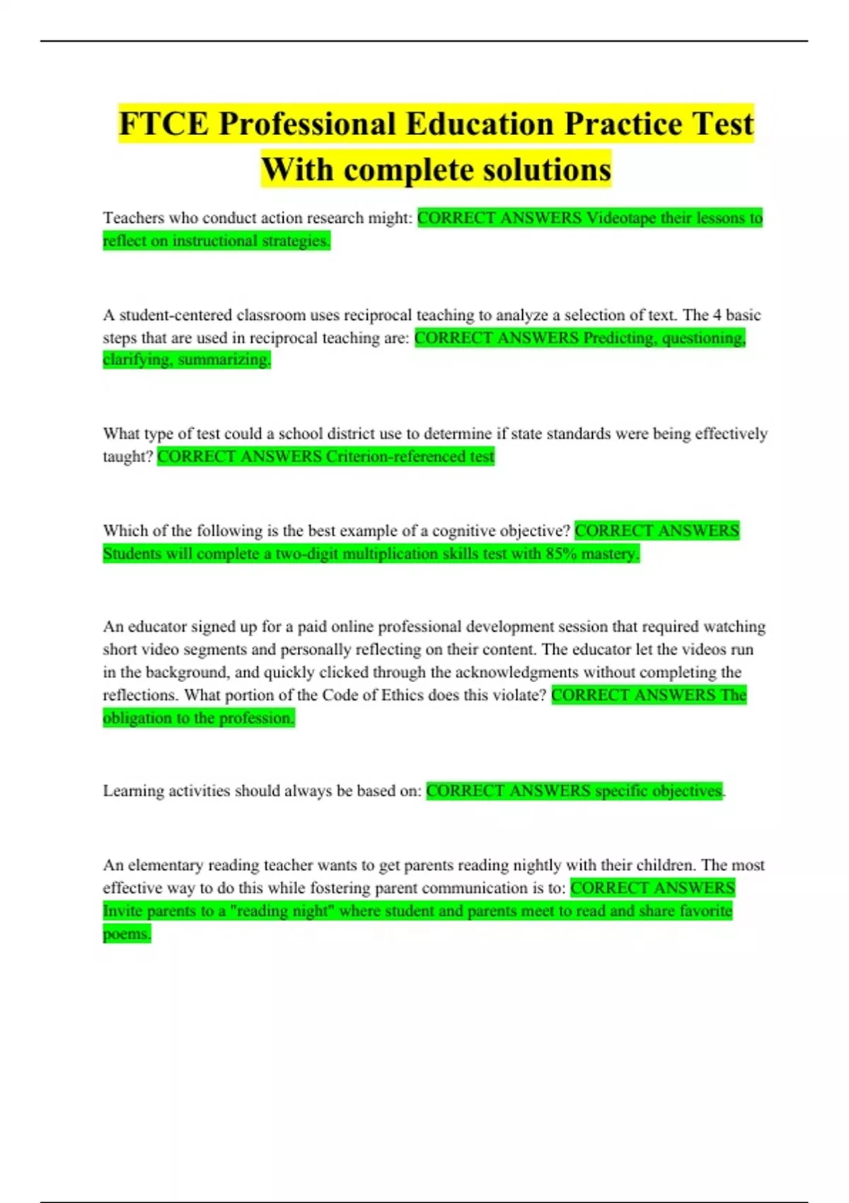 FTCE Professional Education Practice Test With complete solutions Teachers who conduct action research might: A student-centered classroom uses reciprocal teaching to analyze a selection of text. The 4 basic steps that are used in reciprocal teaching are: What type of test could a school district use to determine if state standards were being effectively taught? Which of the following is the best example of a cognitive objective? An educator signed up for a paid online professional development session that required watching short video segments and personally reflecting on their content. The educator let the videos run in the background, and quickly clicked through the acknowledgments without completing the reflections. What portion of the Code of Ethics does this violate? Learning activities should always be based on:. An elementary reading teacher wants to get parents reading nightly with their children. The most effective way to do this while fostering parent communication is to: Which of the following statements from a teacher would be considered classroom management through use of negative reinforcement? In order to practice effective behavior management, classroom rules Which of the following would be a responsibility of a school advisory council? Which of the following would be an example of negative reinforcement? A teacher has discovered and implemented a new online behavior-management program that is improving student behavior while providing an easy way to communicate with parents. The teacher should The best tool for a teacher to use to keep a running, averaged record of student scores throughout the year is The most effective way to present vocabulary is The best graphic organizer for analyzing similarities and differences is