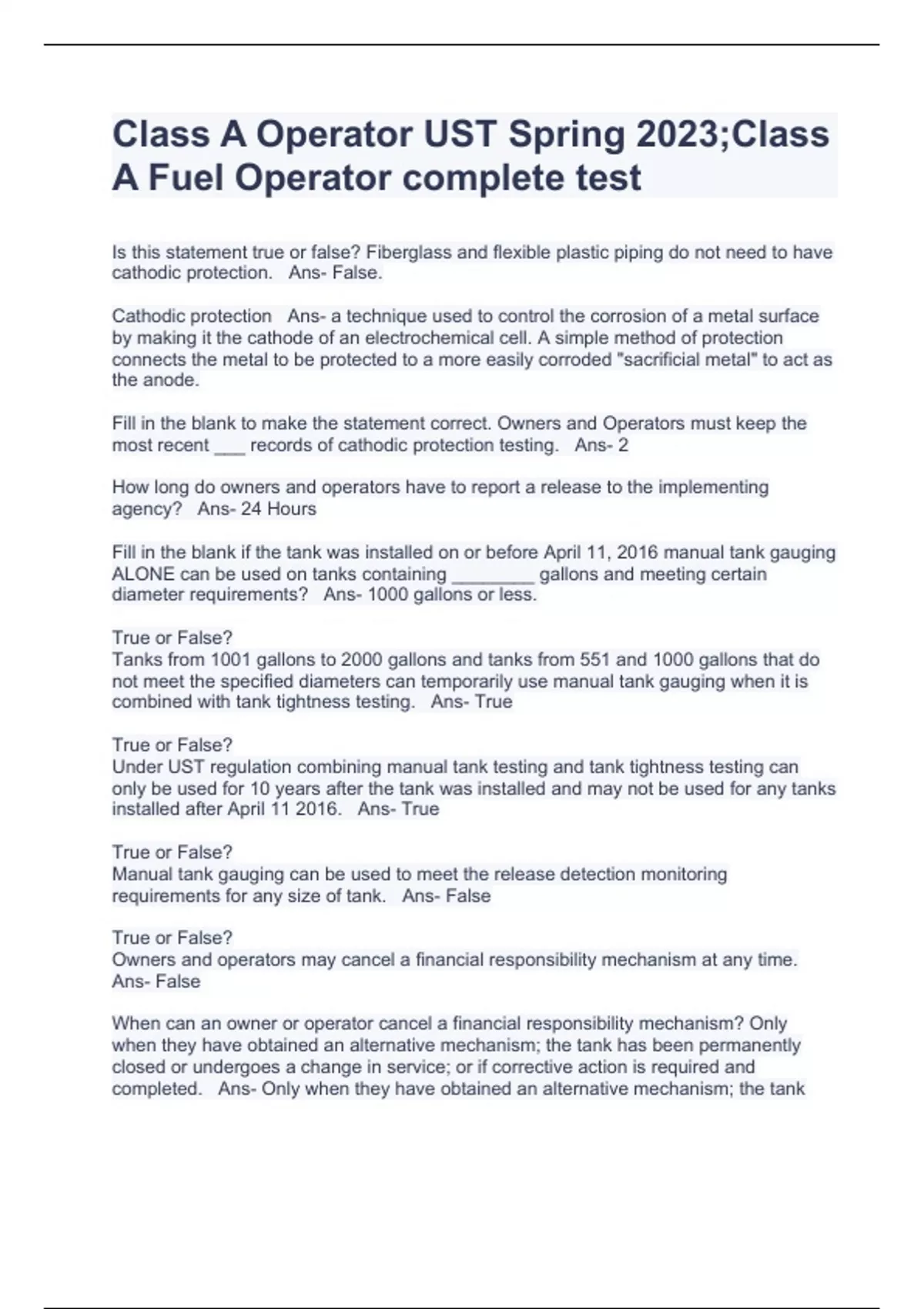 Class A Operator UST Spring 2023;Class A Fuel Operator complete test
