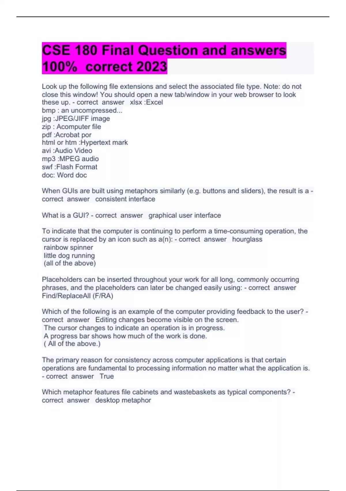 CSE 180 Final Question and answers 100% correct 2023Look up the following file extensions and select the associated file type. Note: do not close this window! You should open a new tab/window in your web browser to look these up. xlsx :Excel bmp : an uncompressed... jpg :JPEG/JIFF image zip : Acomputer file pdf :Acrobat por html or htm :Hypertext mark avi :Audio Video mp3 :MPEG audio swf :Flash Format doc: Word doc When GUIs are built using metaphors similarly (e.g. buttons and sliders), the result is a consistent interface What is a GUI? graphical user interface To indicate that the computer is continuing to perform a time-consuming operation, the cursor is replaced by an icon such as a(n): hourglass rainbow spinner little dog running (all of the above) Placeholders can be inserted throughout your work for all long, commonly occurring phrases, and the placeholders can later be changed easily using: Find/ReplaceAll (F/RA) Which of the following is an example of the computer providing feedback to the user? Editing changes become visible on the screen. The cursor changes to indicate an operation is in progress. A progress bar shows how much of the work is done. ( All of the above.) The primary reason for consistency across computer applications is that certain operations are fundamental to processing information no matter what the application is. True Which metaphor features file cabinets and wastebaskets as typical components? desktop metaphor A good way to learn how to use a new application or piece of software is to click around The mouse was invented by: Douglas Engelbart and others at Stanford Research Institute Perfect reproduction is a property of: digital information A WAN is to TCP/IP as LAN is to: Ethernet