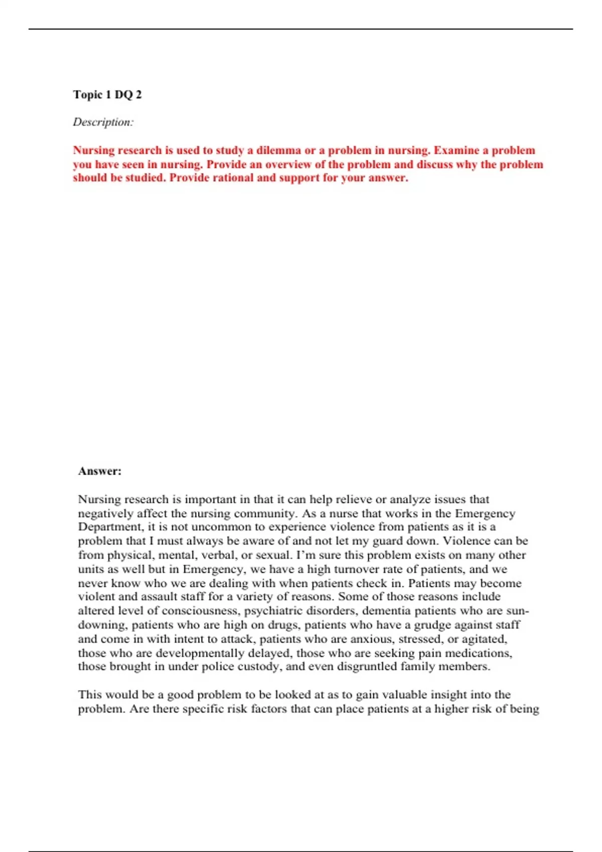 Topic 1 DQ 2 Description: Nursing research is used to study a dilemma or a problem in nursing. Examine a problem you have seen in nursing. Provide an overview of the problem and discuss why the problem should be studied. Provide rational and support for your answer.