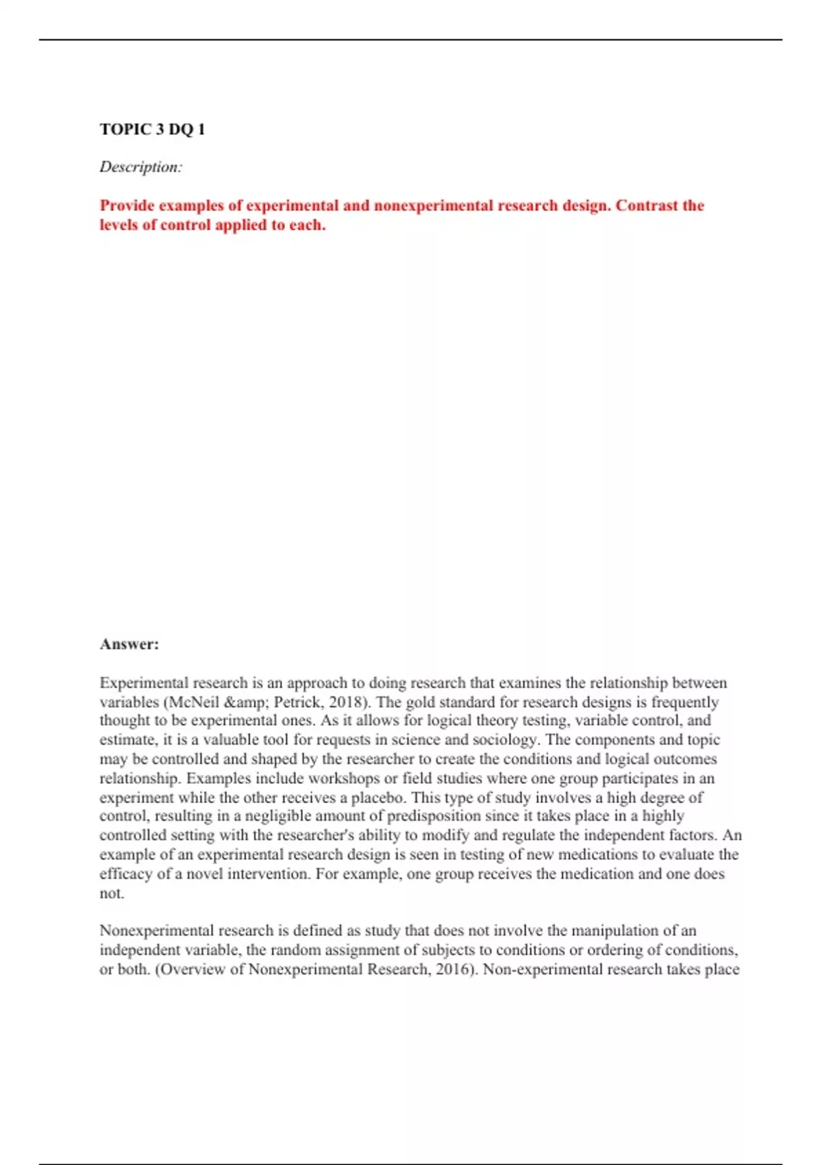 TOPIC 3 DQ 1 Description: Provide examples of experimental and nonexperimental research design. Contrast the levels of control applied to each.