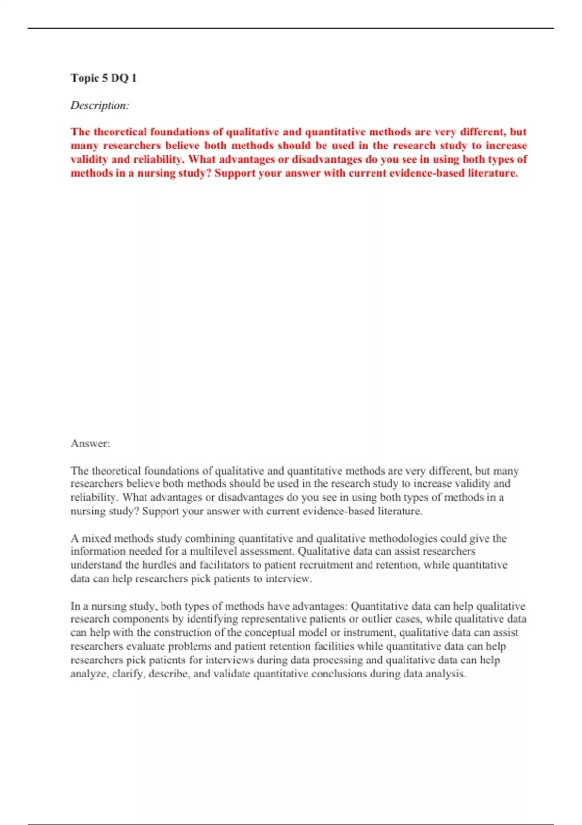 Topic 5 DQ 1 Description: The theoretical foundations of qualitative and quantitative methods are very different, but many researchers believe both methods should be used in the research study to increase validity and reliability. What advantages or disadvantages do you see in using both types of methods in a nursing study? Support your answer with current evidence-based literature.