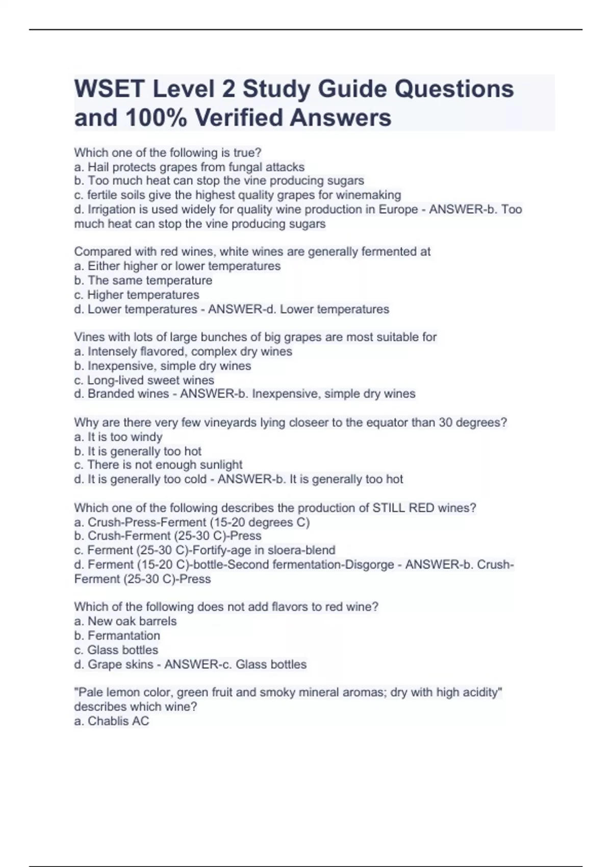 WSET Level 2 Study Guide Questions and 100% Verified AnswersWSET Level 2 Study Guide Questions and 100% Verified AnswersWSET Level 2 Study Guide Questions and 100% Verified Answers Which one of the following is true? a. Hail protects grapes from fungal attacks b. Too much heat can stop the vine producing sugars c. fertile soils give the highest quality grapes for winemaking d. Irrigation is used widely for quality wine production in Europe - ANSWER-b. Too much heat can stop the vine producing sugars Compared with red wines, white wines are generally fermented at a. Either higher or lower temperatures b. The same temperature c. Higher temperatures d. Lower temperatures - ANSWER-d. Lower temperatures Vines with lots of large bunches of big grapes are most suitable for a. Intensely flavored, complex dry wines b. Inexpensive, simple dry wines c. Long-lived sweet wines d. Branded wines - ANSWER-b. Inexpensive, simple dry wines Why are there very few vineyards lying closeer to the equator than 30 degrees? a. It is too windy b. It is generally too hot c. There is not enough sunlight d. It is generally too cold - ANSWER-b. It is generally too hot Which one of the following describes the production of STILL RED wines? a. Crush-Press-Ferment (15-20 degrees C) b. Crush-Ferment (25-30 C)-Press c. Ferment (25-30 C)-Fortify-age in sloera-blend d. Ferment (15-20 C)-bottle-Second fermentation-Disgorge - ANSWER-b. Crush-Ferment (25-30 C)-Press Which of the following does not add flavors to red wine? a. New oak barrels b. Fermantation c. Glass bottles d. Grape skins - ANSWER-c. Glass bottles "Pale lemon color, green fruit and smoky mineral aromas; dry with high acidity" describes which wine? a. Chablis AC