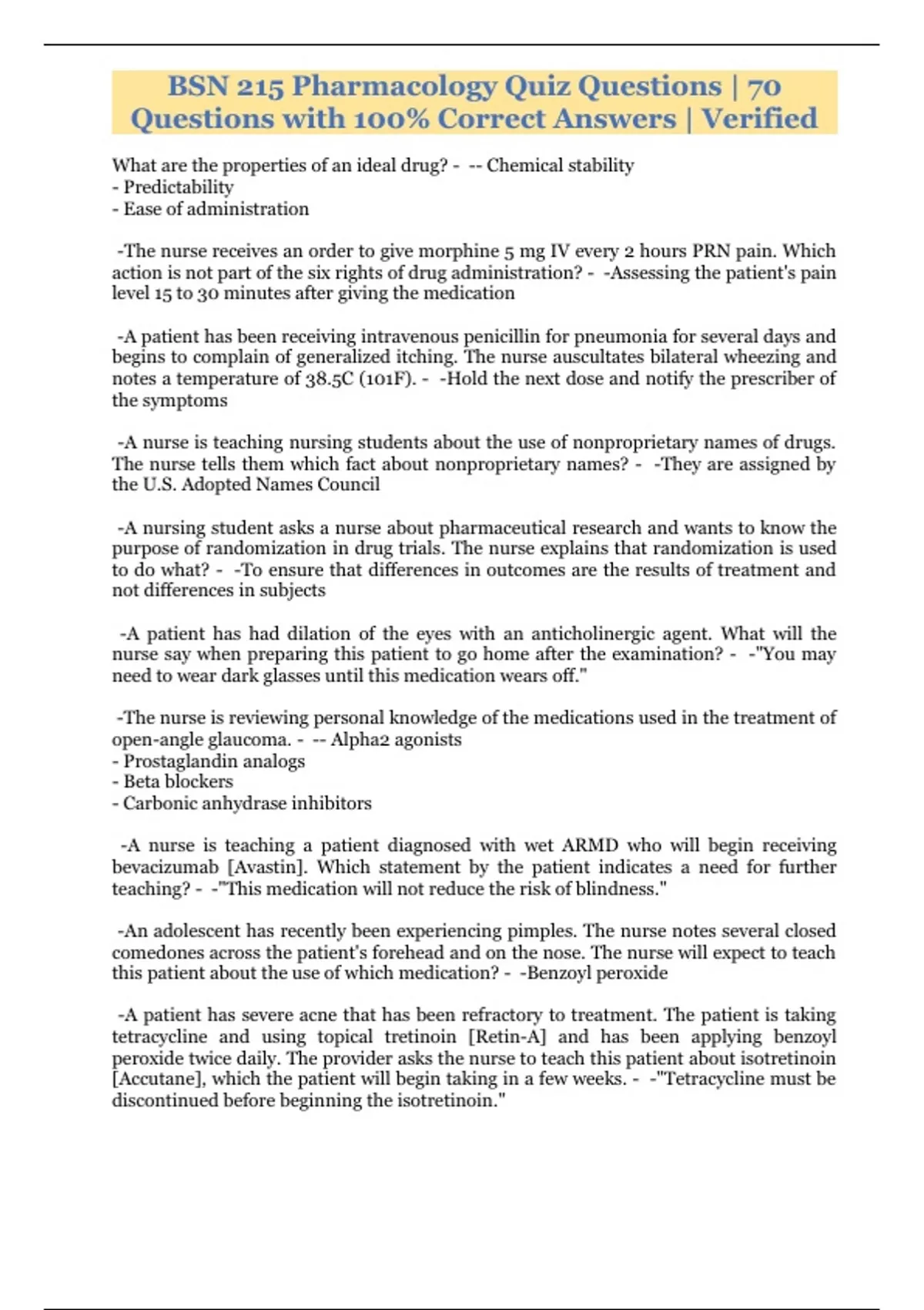 BSN 215 Pharmacology Quiz Questions | 70 Questions with 100% Correct Answers | Verified