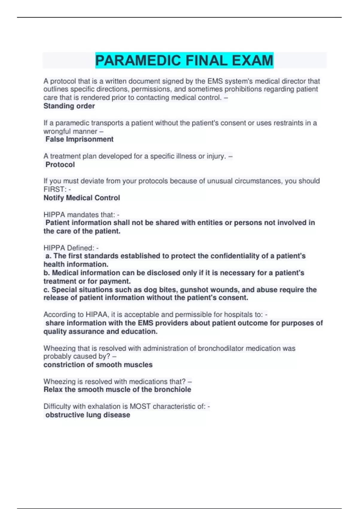 PARAMEDIC FINAL EXAM FIRST CLASS A