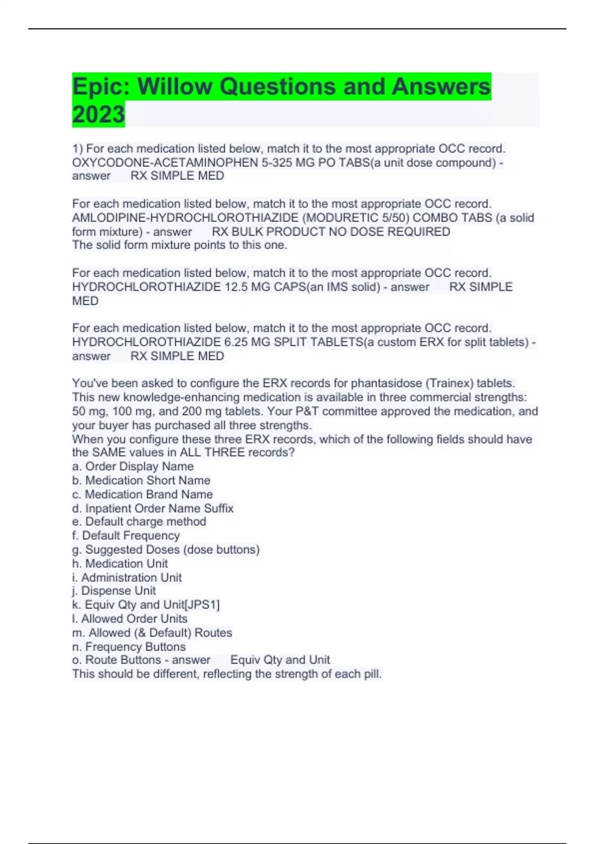 Epic: Willow Questions and Answers 2023 1) For each medication listed below, match it to the most appropriate OCC record. OXYCODONE-ACETAMINOPHEN 5-325 MG PO TABS(a unit dose compound) RX SIMPLE MED For each medication listed below, match it to the most appropriate OCC record. AMLODIPINE-HYDROCHLOROTHIAZIDE (MODURETIC 5/50) COMBO TABS (a solid form mixture) RX BULK PRODUCT NO DOSE REQUIRED The solid form mixture points to this one. For each medication listed below, match it to the most appropriate OCC record. HYDROCHLOROTHIAZIDE 12.5 MG CAPS(an IMS solid) RX SIMPLE MED For each medication listed below, match it to the most appropriate OCC record. HYDROCHLOROTHIAZIDE 6.25 MG SPLIT TABLETS(a custom ERX for split tablets) RX SIMPLE MED You've been asked to configure the ERX records for phantasidose (Trainex) tablets. This new knowledge-enhancing medication is available in three commercial strengths: 50 mg, 100 mg, and 200 mg tablets. Your P&T committee approved the medication, and your buyer has purchased all three strengths. When you configure these three ERX records, which of the following fields should have the SAME values in ALL THREE records? a. Order Display Name b. Medication Short Name c. Medication Brand Name d. Inpatient Order Name Suffix e. Default charge method f. Default Frequency g. Suggested Doses (dose buttons) h. Medication Unit i. Administration Unit j. Dispense Unit k. Equiv Qty and Unit[JPS1] l. Allowed Order Units m. Allowed (& Default) Routes n. Frequency Buttons o. Route Buttons Equiv Qty and Unit This should be different, reflecting the strength of each pill. Which of the three phantasidose (Trainex) tablet ERX records should be on your central pharmacy's medication list? What about on your formulary medication list? All three should be on both 1) On each of the lists in question 3, which ERX records should have a green dot next to them? Why? Only the 50 mg tab should have a dot. It's an IMS drug (multiple strengths of the same drug + form), so you only want/need one of them on the linked preference lists. 1) After you set the records up, a technician approaches you with this first dose label for 3 first doses: He points out the dispense amount. "1.5 tablets? But we don't dispense partial tablets unless they've been split and repackaged in bulk." He's right, you don't. Which of the following do you need to do to fix this? Choose ONE answer only. a) Change the Allowed Order Units in the ERX record to only include "tablet" b) Change the Default Dispense Code to "Solid Form Mixture" in the ERX record c) Change the Dispense Rnd Factor to "1" in the ERX record[JPS1] d) On the Label Routing table for your pharmacy, change the Group? column for this dispense code This is the problem. Each dose is 0.5 tablets, but in this scenario, you should be dispensing 3 separate tablets. The Rnd Factor is set to 0.5 (or blank). And yes, it should be 3 tablets being dispensed. There are 3 first doses. Each one should have a dispense amount of 1 tablet. This label is grouped, so it should be 3 tablets for 3 doses. 1) Trainex has been so popular that there's now a shortage on 50 mg tablets. You run out! The 100 mg are still available, so you start splitting them in bulk and repackaging them as 50 mg "split tablets." You configure your custom ERX for phantasidose (Trainex) 50 mg split tablets, add it to your central med list, and select it in the Orders activity. But when you change the dose from 50 mg to 100 mg, it doesn't change to the 100 mg tablets; it's dispensing 2 x 50 mg split tablets from Central Pharmacy. Name two settings that could be preventing IMS from working correctly.[JPS1] [JPS1]See chapter 3 In the ERX, possible culprits are: · Use IMS when this is ordered? (should be Yes) · GPI/GMI/GPK: must match commercially available products. · Medication Unit: must be in units like mg, not tablet or split tablet. Also: maybe you've only got 50 mg split tabs on the central list. You might have accidentally removed the 100 mg tabs from the list! The Strength & Strength Unit are also important, but not in this specific scenario. If they were wrong in the commercially available 100 mg tab record, they could prevent the system from changing to them. But if it was wrong in the 50 mg split tab, you'd see the problem when the dose 50 mg, not when you changed it to 100 mg. Also, the Proxy might come up, but it's not about IMS. See next question. See chapter 3 In the ERX, possible culprits are: · Use IMS when this is ordered? (should be Yes) · GPI/GMI/GPK: must match commercially available products. · Medication Unit: must be in units like mg, not tablet or split tablet. Also: maybe you've only got 50 mg split tabs on the central list. You might have accidentally removed the 100 mg tabs from the list! The Strength & Strength Unit are also important, but not in this specific scenario. If they were wrong in the commercially available 100 mg tab record, they could prevent the system from changing to them. But if it was wrong in the 50 mg split tab, you'd see the problem when the dose 50 mg, not when you changed it to 100 mg. Also, the Proxy might come up, but it's not about IMS. See next question. The makers of phantasidose (Trainex) tablets also manufacture Super Trainex, or METHYLPHENIDATE-PHANTASIDOSE 10-50 MG PO TABS. Your hospital has started to get patients who have PTA prescriptions for it, and your physicians are ordering it during med rec. Your P&T committee hasn't approved Super Trainex, but they have approved METHYLPHENIDATE HCL 10 MG PO TABS. 1) Which of the following should you create? (choose ALL that apply) a) An "and" linked panel for Super Trainex b) A custom simple ERX record for Super Trainex c) A solid-form mixture for Super Trainex d) An inpatient Alternative record that redirects away from the Super Trainex[JPS1] simple ERX [JPS1]These two. Though, the second one is BTB. Try it out with Vytorin. · On Caleb >> Admission >> Admission Orders >> Review PTA meds à add Vy