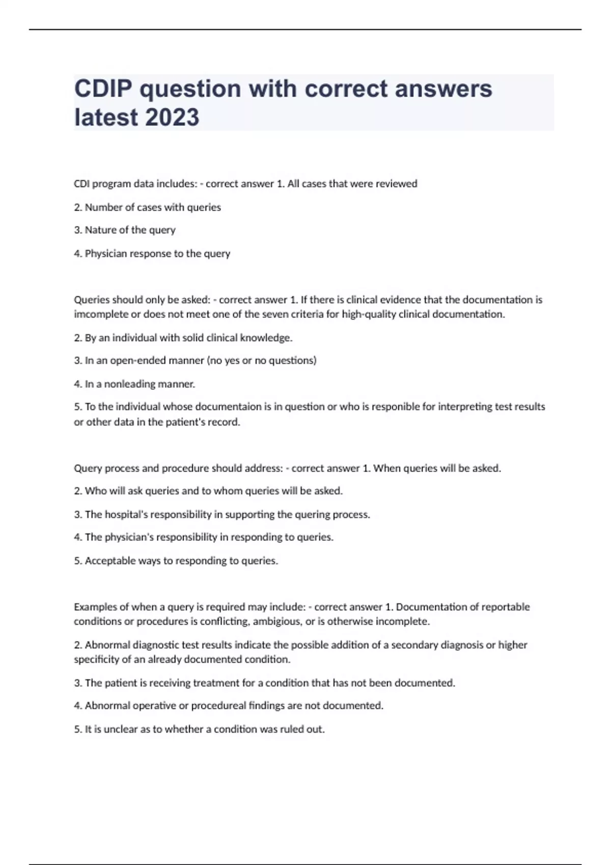 CDIP question with correct answers latest 2023 CDI program data includes: - correct answer 1. All cases that were reviewed 2. Number of cases with queries 3. Nature of the query 4. Physician response to the query Queries should only be asked: - correct answer 1. If there is clinical evidence that the documentation is imcomplete or does not meet one of the seven criteria for high-quality clinical documentation. 2. By an individual with solid clinical knowledge. 3. In an open-ended manner (no yes or no questions) 4. In a nonleading manner. 5. To the individual whose documentaion is in question or who is responible for interpreting test results or other data in the patient's record. Query process and procedure should address: - correct answer 1. When queries will be asked. 2. Who will ask queries and to whom queries will be asked. 3. The hospital's responsibility in supporting the quering process. 4. The physician's responsibility in responding to queries. 5. Acceptable ways to responding to queries. Examples of when a query is required may include: - correct answer 1. Documentation of reportable conditions or procedures is conflicting, ambigious, or is otherwise incomplete. 2. Abnormal diagnostic test results indicate the possible addition of a secondary diagnosis or higher specificity of an already documented condition. 3. The patient is receiving treatment for a condition that has not been documented. 4. Abnormal operative or procedureal findings are not documented. 5. It is unclear as to whether a condition was ruled out. 6. The pricipal diagnosis is not clearly identified. Septicemia - correct answer A systemic disease with the presence and persistence of pathogenic micro-organisms or toxins in the blood. No longer considered synonymous with sepsis. Sepsis - correct answer Sepsis is SIRS due to an infection . Infection can originate anywhere in the body and be triggered by a bacterial, viral, parasitic, or fungal infection. Severe Sepsis - correct answer SIRS due to infection with organ dysfunction. Sepsis associated with acute dysfunction in one or more organs. Organ dysfunction bay be cardiovascular, renal, respiratory, hepatic, hematological, central nervous system, or metabolic acidosis. SIRS - correct answer SIRS is the systemic response to infection or trauma. The systemic response is manifested by a variety of clinical signs and symptoms such as: Fever (100.4 degrees F), Hypothermia (96.8 degrees F), WBC = to 12000 cellsmm3 (leukocytosis), WBC = to 4000 cells/mm3 or 10% immature cells, heart reat 90 bpm, respirations 20 breaths/minute or PcCO2 32 mg of mercury, hypotension, altered mental status. Septic Shock - correct answer Sepsis with hypotension or a failure of the cardiovascular system. Endotoxic shock and gram negative shock are synomymous with septic shock, septic shock = severe sepsis Bacteremia - correct answer Bacteria in the blood without an associated inflammatory response. Denotes laboratory findings of viable bateria in the blood with no systemic manifestations. Progresses to septicemia only when there is a more severe infections process or an impaired immune system. Urosepsis - correct answer Infection confined to the urinary system. Refers to pyuria or bacteria in the urine (not in the blood). Query the physician to determine if the bacteria in the urine has progressed to septicemia or sepsis.