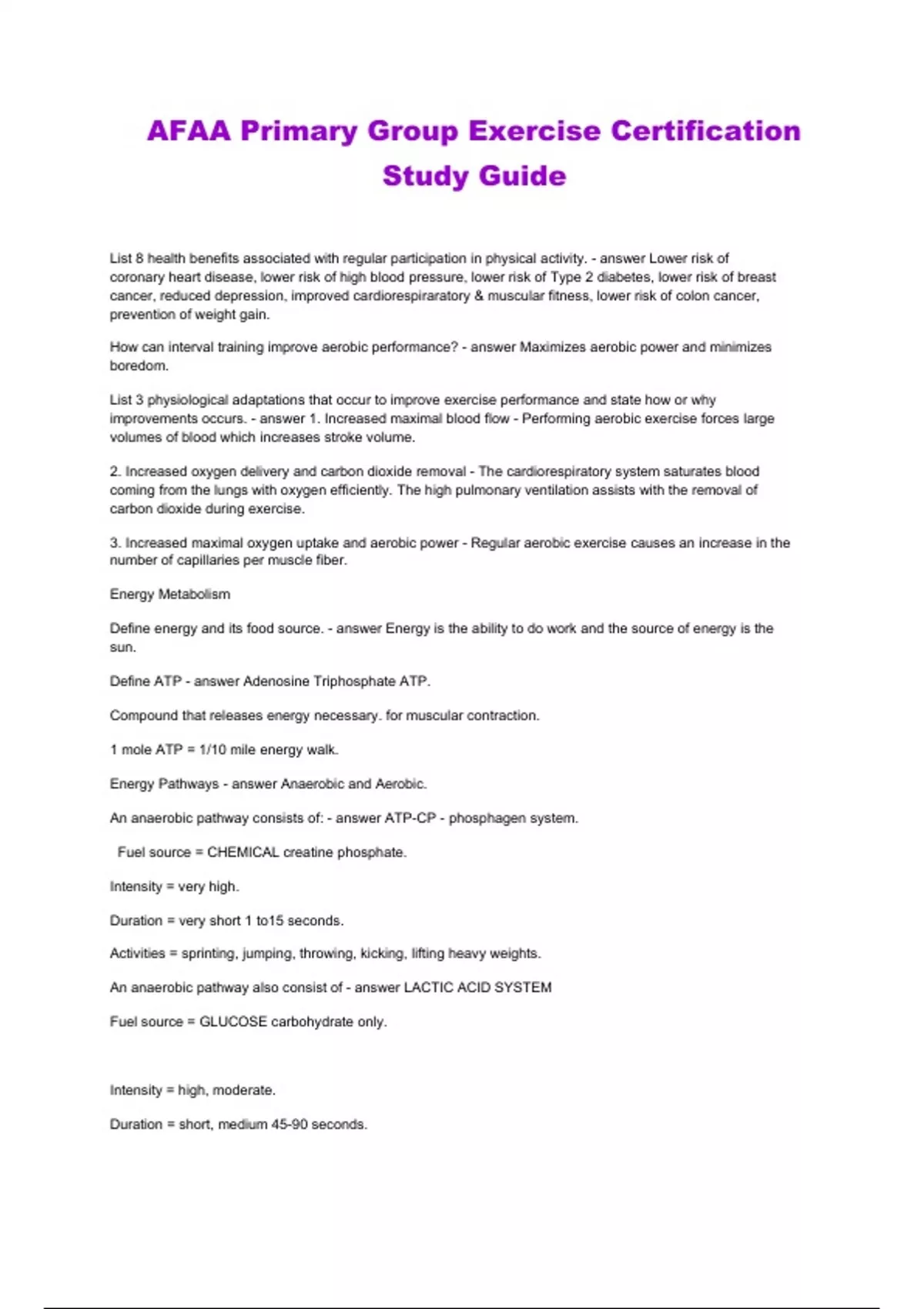AFAA Primary Group Exercise Certification Study Guide with 100% Correct Answers. List 8 health benefits associated with regular participation in physical activity. - answer Lower risk of coronary heart disease, lower risk of high blood pressure, lower risk of Type 2 diabetes, lower risk of breast cancer, reduced depression, improved cardiorespiraratory & muscular fitness, lower risk of colon cancer, prevention of weight gain. How can interval training improve aerobic performance? - answer Maximizes aerobic power and minimizes boredom. List 3 physiological adaptations that occur to improve exercise performance and state how or why improvements occurs. - answer 1. Increased maximal blood flow - Performing aerobic exercise forces large volumes of blood which increases stroke volume. 2. Increased oxygen delivery and carbon dioxide removal - The cardiorespiratory system saturates blood coming from the lungs with oxygen efficiently. The high pulmonary ventilation assists with the removal of carbon dioxide during exercise. 3. Increased maximal oxygen uptake and aerobic power - Regular aerobic exercise causes an increase in the number of capillaries per muscle fiber. Energy Metabolism Define energy and its food source. - answer Energy is the ability to do work and the source of energy is the sun. Define ATP - answer Adenosine Triphosphate ATP. Compound that releases energy necessary. for muscular contraction. 1 mole ATP = 1/10 mile energy walk. Energy Pathways - answer Anaerobic and Aerobic. An anaerobic pathway consists of: - answer ATP-CP - phosphagen system. Fuel source = CHEMICAL creatine phosphate. Intensity = very high. Duration = very short 1 to15 seconds. Activities = sprinting, jumping, throwing, kicking, lifting heavy weights. An anaerobic pathway also consist of - answer LACTIC ACID SYSTEM Fuel source = GLUCOSE carbohydrate only. Intensity = high, moderate. Duration = short, medium 45-90 seconds. Activities = prolonged sprints, soccer, basketball, hockey, swimming, cycling. aerobic pathway consists of: - answer AEROBIC SYSTEM Fuel source = Carbohydrates, fat, protein. Intensity = moderate, low. Duration = medium, very long 3-5 minutes Activities = sitting, reading, studying, watching TV, internet surfing, sleeping, walking, biking, rowing, skating, distance running, aerobics. Define: Aerobic - answer Aerobic is with oxygen or the presence of oxygen. Define: Anaerobic - answer Anaerobic is without oxygen; usually w/short-spurt, high-energy activities What is the term for Steady state: - answer After first 3-4 minutes of exercise, oxygen uptake has reached an adequate level to meet oxygen demand of the tissues; heart rate, cardio output, and pulmonary ventilation have attained fairly constant levels. What is the term for Excess post-oxygen consumption EPOC - answer Oxygen debt referring to oxygen uptake remaining elevated above resting levels for several minutes during recovery. What is the term for Oxygen deficit - answer Period in which the level of oxygen consumption is below what is necessary to supply ATP production. What is the term for Anaerobic threshold - answer Point at which the body can no longer meet its demand for oxygen and anaerobic metabolism is accelerated. What is the term for Aerobic capacity - answer Ability of the body to remove oxygen from the air and transfer it through the lungs and blood to the working muscles; related to cardiorespiratory endurance. What is the term for Lactic acid - answer By-product of anaerobic metabolism of glucose; milk sugar. Aerobic vs. Anaerobic - answer Aerobic - Complete breakdown of glucose. Anaerobic - Partial breakdown of glucose. Aerobic - Can utilize carbs, fats, or proteins as fuel. Anaerobic - Can only use carbs as fuel. Aerobic - Long-duration of activity. Anaerobic - Short-duration of activity. Aerobic - Smaller EPOC. Anaerobic - Greater EPOC. Aerobic - Sub maximal, work moderate intensity. Anaerobic - Maximal work,,high intensity. Aerobic - Carbon dioxide and water are end products. Anaerobic - Lactic acid is the by-product. Aerobic - Uses oxygen in chemical breakdown. Anaerobic - Doesn't need Oxigen in chemical breakdown. What is the term for Stroke volume - answer Volume of blood ejected by each ventricle of the heart during a single systole. What is the term for Cardiac output - answer Volume of blood pumped by each ventricle in one minute. What is the term for Venous return - answer Pumping action of the muscles in extremities and respiratory system along with venoconstriction to move oxygen blood back to the heart. What is the term for Blood pooling - answer Condition caused by ceasing vigorous exercise too abruptly so that blood remains in the extremities and may not be delivered quickly enough to the heart and brain. What is the term for Vital capacity - answer Greatest volume of air that can be forcibly exhaled after the deepest inspiration. What is the term for Valsalva maneuver - answer Dangerous condition that can occur if an individual holds their breath forming an unequal pressure in the brain. Dizziness, temporary loss of consciousness may occur. What are blood pressure norms for a healthy person? - answer Resting Blood Pressure for healthy person averages about 120 - 80. High Blood Pressure is considered 140 - 90+ What is the anatomical term for Joint - answer The point at which two or more bones meet and movement occurs: synovial, non-synovial. What is the anatomical term for Ligament - answer Bands or sheet-like fibrous tissues connecting bone-to-bone and reinforces joints from dislocation, non-elastic, limited ROM. What is the anatomical term for Tendon - answer Band of dense fibrous tissues forming the termination of a muscle and attaching muscle to the bone with minimum elasticity. What is the anatomical term for Cartilage - answer White, semi-opague fiborous connective tissue; cushions and prevents wear on articular surfaces.