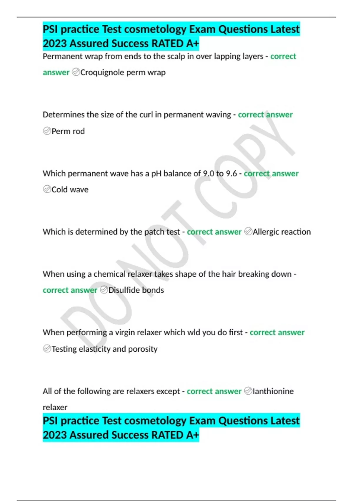 PSI practice Test cosmetology Exam Questions Latest 2023 Assured Success RATED A+