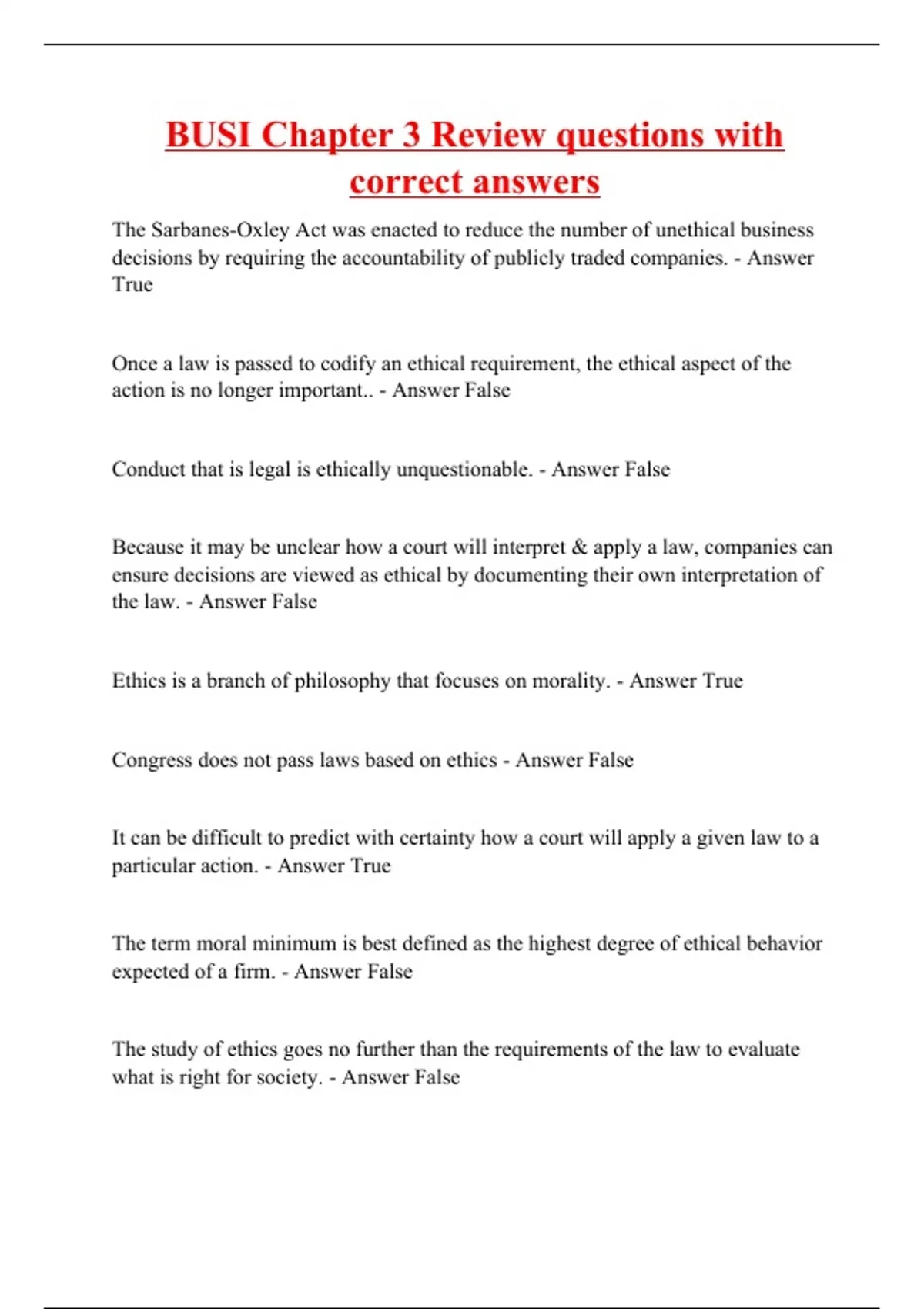 The Sarbanes-Oxley Act was enacted to reduce the number of unethical business decisions by requiring the accountability of publicly traded companies. - Answer True Once a law is passed to codify an ethical requirement, the ethical aspect of the action is no longer important.. - Answer False Conduct that is legal is ethically unquestionable. - Answer False Because it may be unclear how a court will interpret & apply a law, companies can ensure decisions are viewed as ethical by documenting their own interpretation of the law. - Answer False Ethics is a branch of philosophy that focuses on morality. - Answer True Congress does not pass laws based on ethics - Answer False It can be difficult to predict with certainty how a court will apply a given law to a particular action. - Answer True The term moral minimum is best defined as the highest degree of ethical behavior expected of a firm. - Answer False The study of ethics goes no further than the requirements of the law to evaluate what is right for society. - Answer False