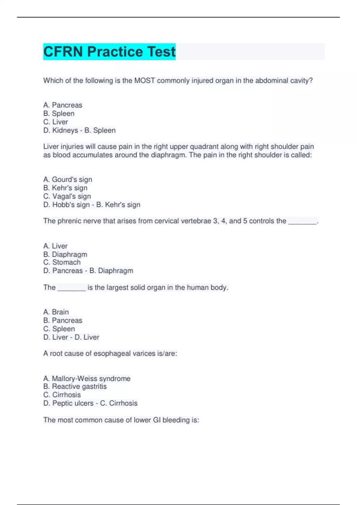 CFRN Practice Test Which of the following is the MOST commonly injured organ in the abdominal cavity? A. Pancreas B. Spleen C. Liver D. Kidneys - B. Spleen Liver injuries will cause pain in the right upper quadrant along with right shoulder pain as blood accumulates around the diaphragm. The pain in the right shoulder is called: A. Gourd's sign B. Kehr's sign C. Vagal's sign D. Hobb's sign - B. Kehr's sign The phrenic nerve that arises from cervical vertebrae 3, 4, and 5 controls the