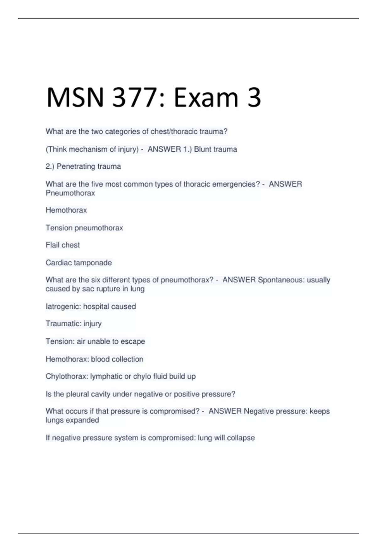 What are the two categories of chest/thoracic trauma? (Think mechanism of injury) - ANSWER 1.) Blunt trauma 2.) Penetrating trauma What are the five most common types of thoracic emergencies? - ANSWER Pneumothorax Hemothorax Tension pneumothorax Flail chest Cardiac tamponade What are the six different types of pneumothorax? - ANSWER Spontaneous: usually caused by sac rupture in lung Iatrogenic: hospital caused Traumatic: injury Tension: air unable to escape Hemothorax: blood collection Chylothorax: lymphatic or chylo fluid build up Is the pleural cavity under negative or positive pressure? What occurs if that pressure is compromised? - ANSWER Negative pressure: keeps lungs expanded If negative pressure system is compromised: lung will collapse Does air show up as white or black on an x-ray? - ANSWER Air = black on x-ray Which type of pneumothorax is a medical emergency? What makes this type of pneumothorax an emergency? - ANSWER Tension pneumothorax As pressure builds in the cavity without a place to escape, the organs of the thoracic cavity are pushed to the side opposite the pneumothorax -Compression of the vessels and heart decreases preload, which decreased cardiac output and causes hemodynamic instability What is the hallmark sign of a tension pneumothorax? - ANSWER Tracheal deviation to the unaffected side