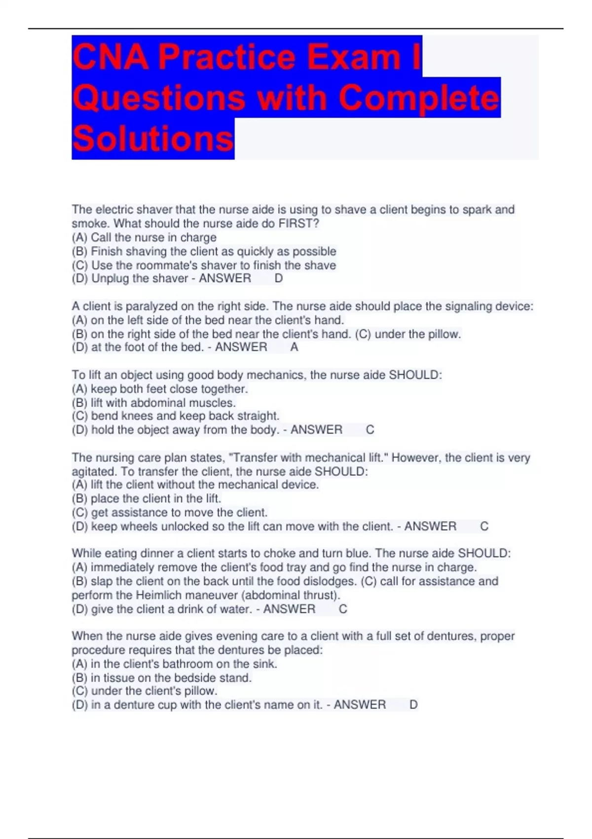 CNA Practice Exam I Questions with Complete Solutions The electric shaver that the nurse aide is using to shave a client begins to spark and smoke. What should the nurse aide do FIRST? (A) Call the nurse in charge (B) Finish shaving the client as quickly as possible (C) Use the roommate's shaver to finish the shave (D) Unplug the shaver - ANSWER D A client is paralyzed on the right side. The nurse aide should place the signaling device: (A) on the left side of the bed near the client's hand. (B) on the right side of the bed near the client's hand. (C) under the pillow. (D) at the foot of the bed. - ANSWER A To lift an object using good body mechanics, the nurse aide SHOULD: (A) keep both feet close together. (B) lift with abdominal muscles. (C) bend knees and keep back straight. (D) hold the object away from the body. - ANSWER C The nursing care plan states, "Transfer with mechanical lift." However, the client is very agitated. To transfer the client, the nurse aide SHOULD: (A) lift the client without the mechanical device. (B) place the client in the lift. (C) get assistance to move the client. (D) keep wheels unlocked so the lift can move with the client. - ANSWER C While eating dinner a client starts to choke and turn blue. The nurse aide SHOULD: (A) immediately remove the client's food tray and go find the nurse in charge. (B) slap the client on the back until the food dislodges. (C) call for assistance and perform the Heimlich maneuver (abdominal thrust). (D) give the client a drink of water. - ANSWER C When the nurse aide gives evening care to a client with a full set of dentures, proper procedure requires that the dentures be placed: (A) in the client's bathroom on the sink. (B) in tissue on the bedside stand. (C) under the client's pillow. (D) in a denture cup with the client's name on it. - ANSWER D What type of fire can be put out with water? (A) Electrical (B) Grease (C) Paper (D) Chemical - ANSWER C The nurse aide is responsible for all of the following fire prevention measures EXCEPT: (A) taking cigarettes and matches away from all clients and visitors. (B) being aware of the locations of fire extinguishers. (C) reporting all damaged wiring and/or sockets in clients' rooms. (D) participating in fire drills. - ANSWER A The nurse aide is going to help the client walk from the bed to a chair. What should the nurse aide put on the client's feet? (A) Socks or stockings only (B) Cloth-soled slippers (C) Rubber-soled slippers or shoes (D) Nothing - ANSWER C The MOST important reason for using soap and water to clean a client's skin after elimination is to: (A) keep the client happy. (B) prevent soiling of bed linen. (C) remove feces and urine from the skin. (D) keep the linen costs down. - ANSWER C The nurse aide should refuse to perform a task if the: (A) nurse aide has not been trained to do it. (B) client is difficult to deal with. (C) nurse aide can find someone else to do it. (D) nurse aide is at the end of the shift. - ANSWER A Before helping a client into a bath or shower, the nurse aide should FIRST: (A) check the temperature of the water. (B) shampoo the client's hair. (C) soak the client's feet. (D) apply lotion or oil to the client's skin. - ANSWER A