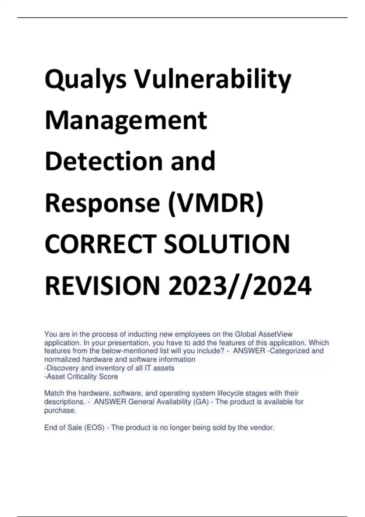 You are in the process of inducting new employees on the Global AssetView application. In your presentation, you have to add the features of this application. Which features from the below-mentioned list will you include? - ANSWER -Categorized and normalized hardware and software information -Discovery and inventory of all IT assets -Asset Criticality Score Match the hardware, software, and operating system lifecycle stages with their descriptions. - ANSWER General Availability (GA) - The product is available for purchase. End of Sale (EOS) - The product is no longer being sold by the vendor. End of Life (EOL) - No longer marketing, selling, building new features or promoting the product Obsolete (OBS) / End of Service - The product is no longer serviced via upgrades, patches, or maintenance. Can you recall the right phases of the VMDR Lifecycle? - ANSWER Asset Management, Vulnerability Management, Threat Detection & Prioritization, Response Which key will enable you to install Qualys Cloud Agent from the VMDR Welcome Page? - ANSWER Default VMDR Activation Key What are the prerequisites to integrate Qualys with ServiceNow CMDB? - ANSWER - Qualys subscription with CyberSecurity Asset Management license -CMDB Sync enabled for Qualys account -Qualys CMDB Sync or Service Graph Connector app installed in ServiceNow If adequate data exists with the Qualys Platform to properly categorize an asset as hardware or OS, but they have yet to be added to the asset catalog, they will be listed as __________. - ANSWER Unknown Describe the query that will produce a list of "patchable" vulnerabilities when entered in the Search field of Vulnerabilities section of VMDR. - ANSWER sPatchable:TRUE State the Qualys sensors that collect the data needed to perform vulnerability assessments. - ANSWER -Scanner Appliance -Cloud Agent Which type of Dashboard Widget can be configured to change color, as its tracked data reaches specific conditions or threshold levels? - ANSWER Count You have to explain to your team how the VMDR for ITSM has some very useful features. Which points will you stress? - ANSWER -Allows rule-based imports of vulnerabilities, risks, and patch recommendations -Provides unified security and IT threat response paths for faster remediation -Assigns vulnerability findings to their appropriate owner, automatically
