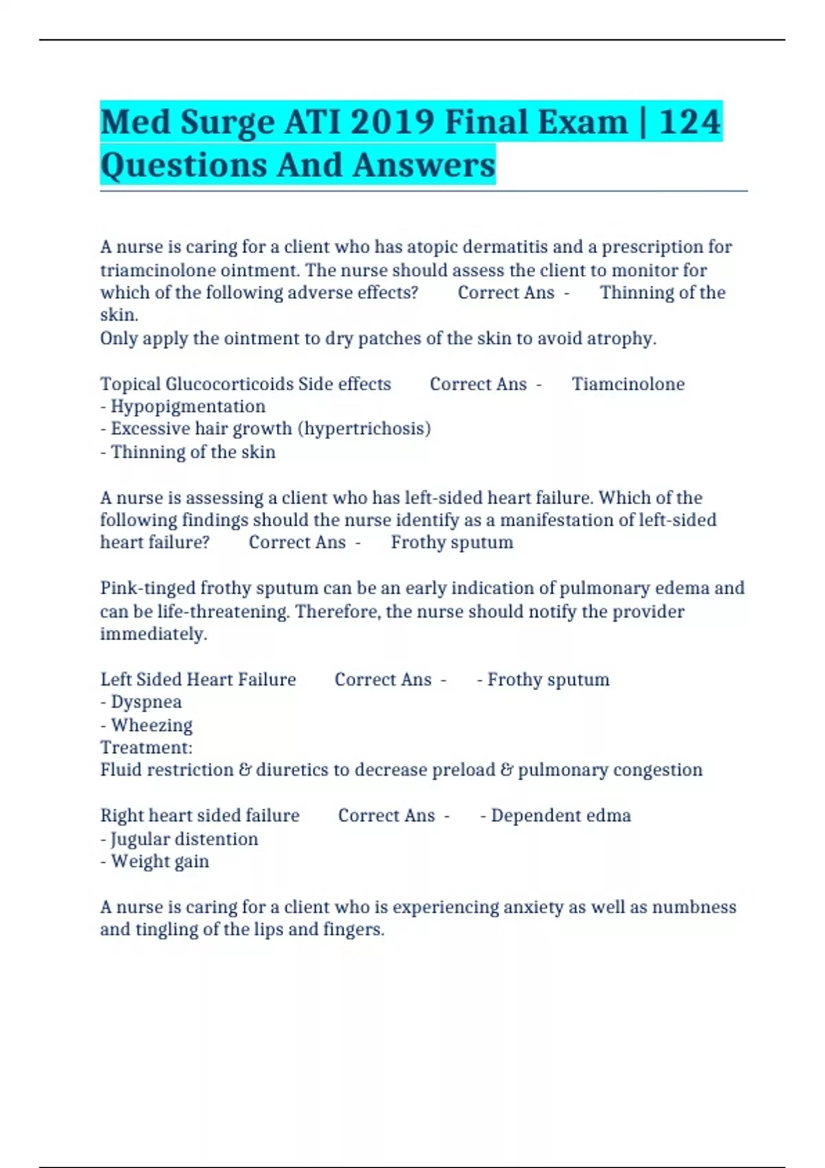 A nurse is caring for a client who has atopic dermatitis and a prescription for triamcinolone ointment. The nurse should assess the client to monitor for which of the following adverse effects? Correct Ans - Thinning of the skin. Only apply the ointment to dry patches of the skin to avoid atrophy. Topical Glucocorticoids Side effects Correct Ans - Tiamcinolone - Hypopigmentation - Excessive hair growth (hypertrichosis) - Thinning of the skin A nurse is assessing a client who has left-sided heart failure. Which of the following findings should the nurse identify as a manifestation of left-sided heart failure? Correct Ans - Frothy sputum Pink-tinged frothy sputum can be an early indication of pulmonary edema and can be life-threatening. Therefore, the nurse should notify the provider immediately. Left Sided Heart Failure Correct Ans - - Frothy sputum - Dyspnea - Wheezing Treatment: Fluid restriction & diuretics to decrease preload & pulmonary congestion Right heart sided failure Correct Ans - - Dependent edma - Jugular distention - Weight gain A nurse is caring for a client who is experiencing anxiety as well as numbness and tingling of the lips and fingers. The client's ABGs are: pH 7.48, PCO2 30 mm Hg, HCO3- 24 mEq/L, PaO2 85 mm Hg. Which of the following acid-base imbalances should the nurse identify that the client is experiencing? Correct Ans - Respiratory alkalosis - The pH is alkaline - PCO2 is low representing alveolar hyperventilation & respiratory alkalosis A nurse is assessing a client who has Cushing's syndrome. Which of the following findings should the nurse expect? Correct Ans - Osteoporosis Bone become thinner as a result of mineral loss & nitrogen depletion. A nurse is inspecting the skin of a client who has basal cell carcinoma. The nurse should identify which of the following lesion characteristics on the client's skin? Correct Ans - A pearly, waxy nodule. - Basal cell carcinoma has a nodular lesion with well defined borders & pearly or waxy apperance from ocerexposure to the sun. Melanoma Correct Ans - Irregular border and varigated colored lesions of red, white, blue. - Most often on the upper back or lower legs Squamous cell carcinoma Correct Ans - Firm, nodular, and crusty lesion with an ulcerated center from sun exposure, chronic irritation, burns, or irradiation to the skin. weeping vescile Correct Ans - Herpes Zoster - Weeping, blister type lesions. A nurse in an emergency department is assessing a client who is overusing prescribed diuretics and has a sodium level of 127 mEq/L. Which of the following laboratory findings should the nurse expect? Correct Ans - LOW URINE SPECFIC GRAVITY.