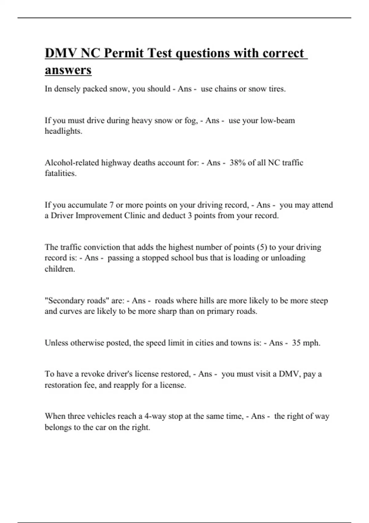 In densely packed snow, you should - Ans - use chains or snow tires. If you must drive during heavy snow or fog, - Ans - use your low-beam headlights. Alcohol-related highway deaths account for: - Ans - 38% of all NC traffic fatalities. If you accumulate 7 or more points on your driving record, - Ans - you may attend a Driver Improvement Clinic and deduct 3 points from your record. The traffic conviction that adds the highest number of points (5) to your driving record is: - Ans - passing a stopped school bus that is loading or unloading children. "Secondary roads" are: - Ans - roads where hills are more likely to be more steep and curves are likely to be more sharp than on primary roads. Unless otherwise posted, the speed limit in cities and towns is: - Ans - 35 mph. To have a revoke driver's license restored, - Ans - you must visit a DMV, pay a restoration fee, and reapply for a license. When three vehicles reach a 4-way stop at the same time, - Ans - the right of way belongs to the car on the right.