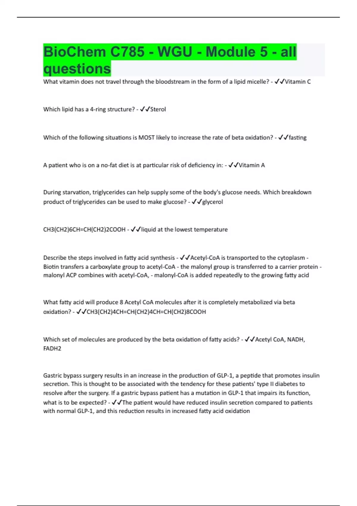 What vitamin does not travel through the bloodstream in the form of a lipid micelle? - Vitamin C Which lipid has a 4-ring structure? - Sterol Which of the following situations is MOST likely to increase the rate of beta oxidation? - fasting A patient who is on a no-fat diet is at particular risk of deficiency in: - Vitamin A During starvation, triglycerides can help supply some of the body's glucose needs. Which breakdown product of triglycerides can be used to make glucose? - glycerol CH3(CH2)6CH=CH(CH2)2COOH - liquid at the lowest temperature Describe the steps involved in fatty acid synthesis - Acetyl-CoA is transported to the cytoplasm - Biotin transfers a carboxylate group to acetyl-CoA - the malonyl group is transferred to a carrier protein - malonyl ACP combines with acetyl-CoA, - malonyl-CoA is added repeatedly to the growing fatty acid What fatty acid will produce 8 Acetyl CoA molecules after it is completely metabolized via beta oxidation? - CH3(CH2)4CH=CH(CH2)4CH=CH(CH2)8COOH Which set of molecules are produced by the beta oxidation of fatty acids? - Acetyl CoA, NADH, FADH2 Gastric bypass surgery results in an increase in the production of GLP-1, a peptide that promotes insulin secretion. This is thought to be associated with the tendency for these patients' type II diabetes to resolve after the surgery. If a gastric bypass patient has a mutation in GLP-1 that impairs its function, what is to be expected? - The patient would have reduced insulin secretion compared to patients with normal GLP-1, and this reduction results in increased fatty acid oxidation